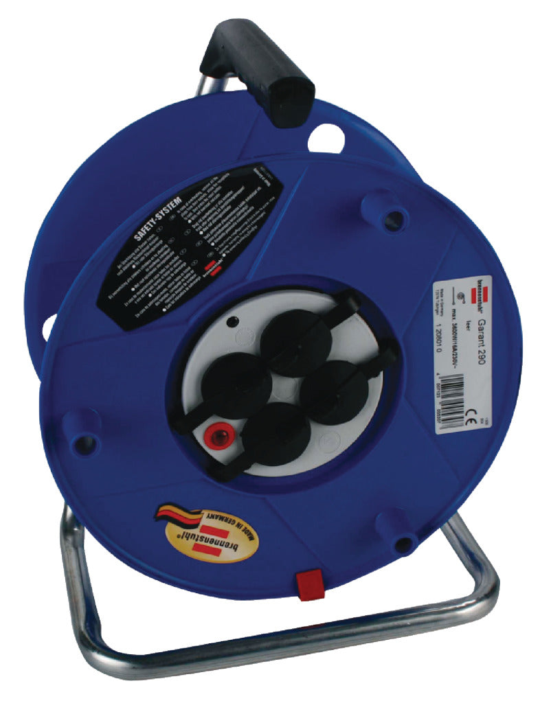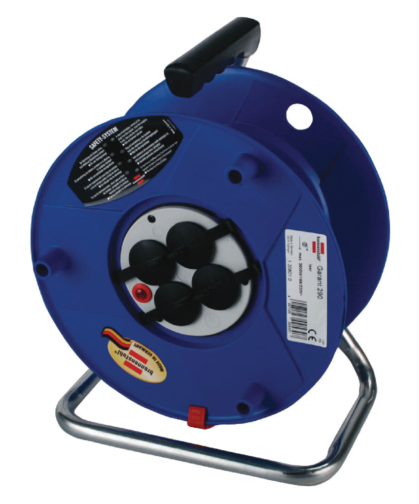 Lege kabelhaspel, bestaande uit breukvaste kunststof op een roestvrij gegalvaniseerd draagbaar frame, met een ergonomisch handvat met roede voor perfecte kabelcontrole bij het open- en afrollen. De haspel heeft 4 stopcontacten.
