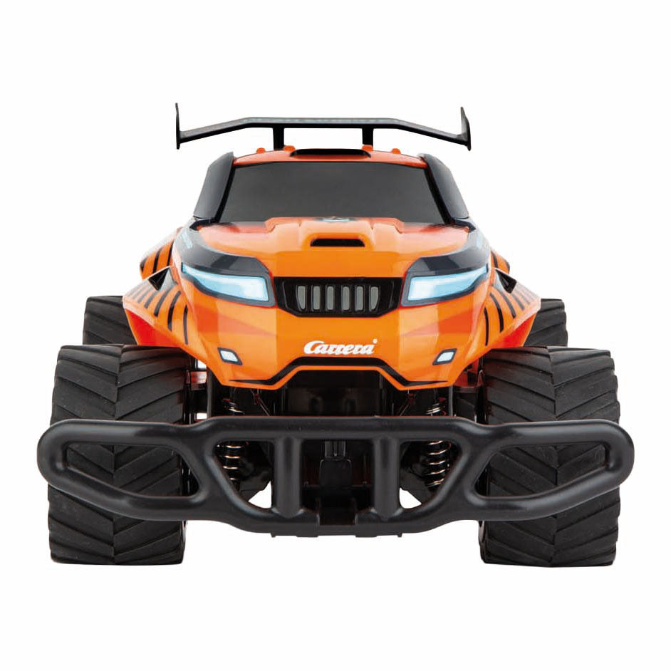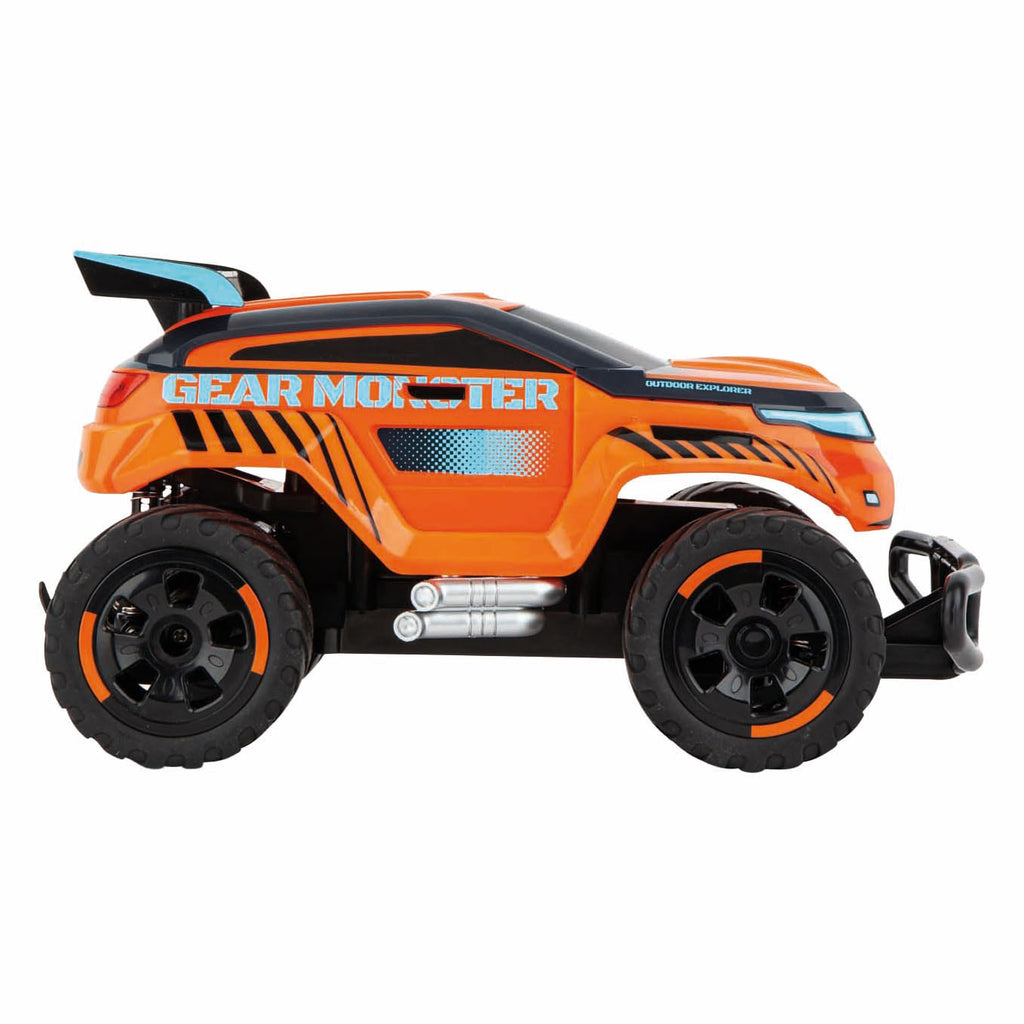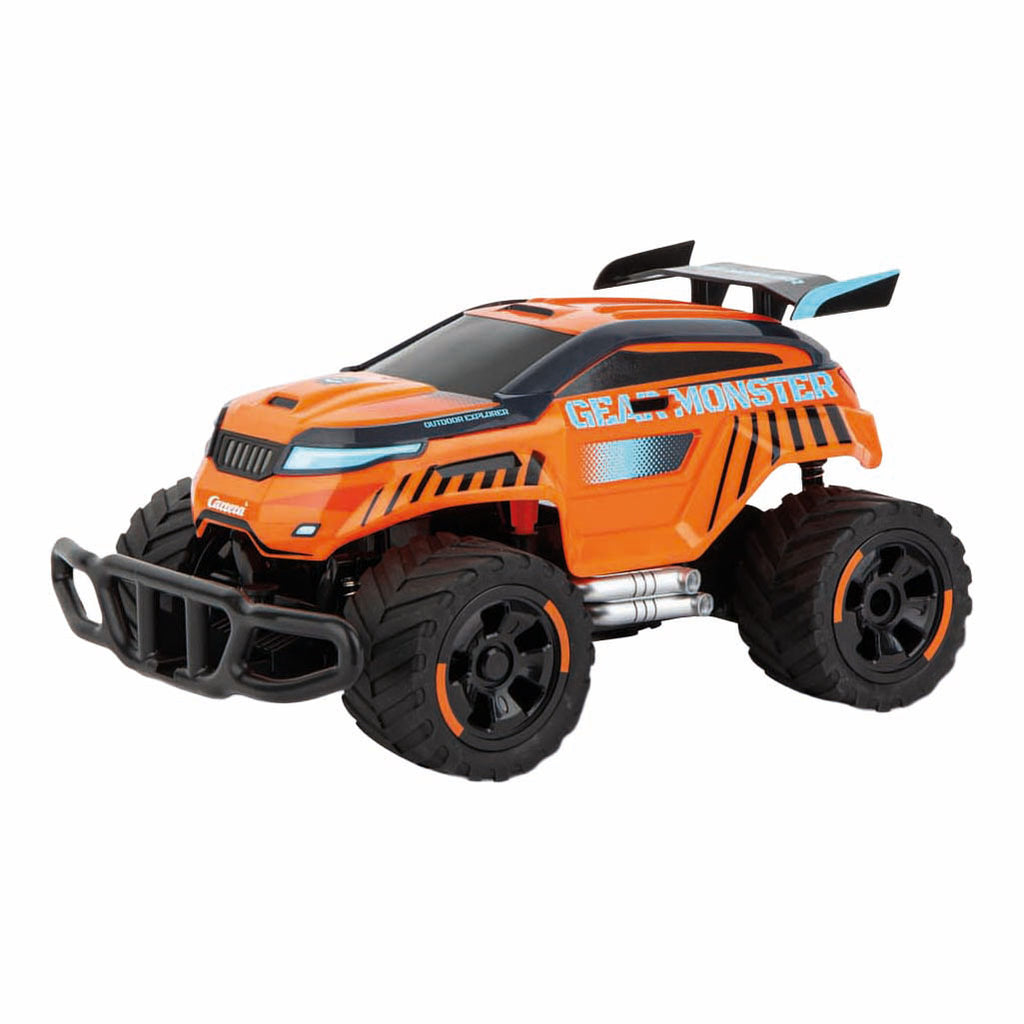 Monster Outdoor Adventures_x000D_ De Carrera RC Gear Monster 3. maakt elk terrein onveilig. De machtige o ffroader in fel oranje is uitgerust met grote luchtbanden die hem over heuvel en dal brengen op koel e ritten. Of het nu op rotsachtige paden of heuvelachtige weiden is - de 28 cm lange offroader schit tert bij topsnelheden tot 12 km/u en brengt veel snelheid in elk avontuur. Dankzij de nauwkeurige Fu ll Function-bedieningselementen zijn spectaculaire manoeuvres en wendbare richtingsveranderingen geg arandeerd. Tot 16 voertuigen kunnen tegelijkertijd strijden in spannende onderlinge races, terwijl d e oplaadbare batterij tot 2 minuten pure actie biedt. Met zijn opvallende oranje ontwerp en nieuwe USB-C-batterij is de Gear Monster 3. altijd klaar om aan je volgende avontuur te beginnen>