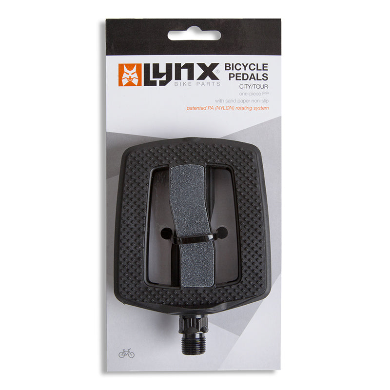 Ces pédales Lynx noires pour vélo / vélo électrique City et Tour ont une double couche antidérapante des deux côtés. La pédale a des crampons hauts et bas sur le bord extérieur et une surface sablée (aspect papier de verre) au milieu. Le roulement breveté en PA (plastique très résistant à l'usure) (roulement ZU) assure une rotation fluide de la pédale autour de l'axe. L'axe de pédale est en acier au bore, du bore a été ajouté à cet acier, ce qui le rend encore plus puissant. Le corps de la pédale est en PP (polypropylène) monobloc, qui est un plastique dur mais flexible. Les pédales sont équipées de réflecteurs et faciles à assembler avec une clé Allen.