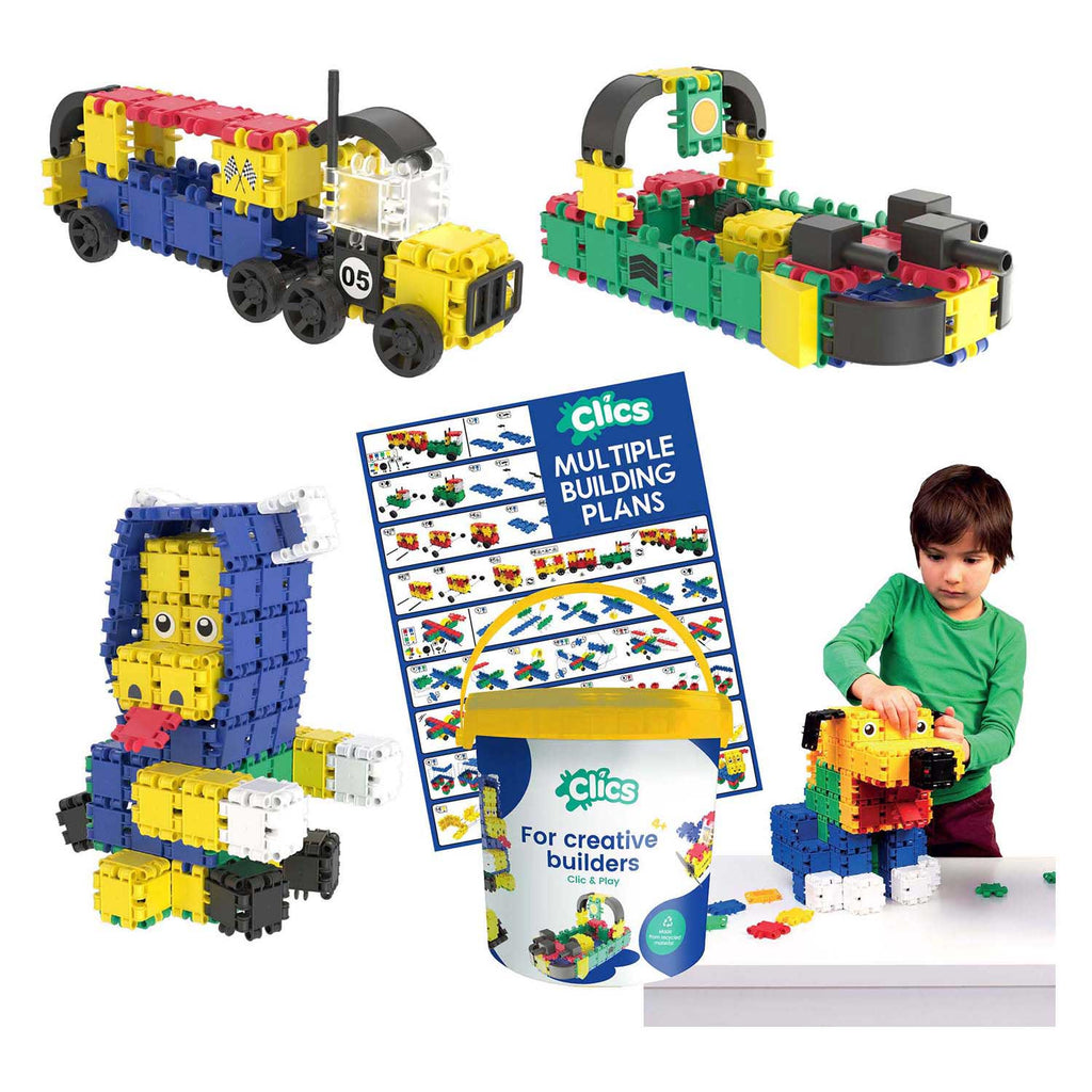 Met de Clics 10 in 1 drum kun je alles bouwen wat je maar wilt! Of het nu een bulldozer, een vrachtwagen, een vliegtuig, een hond of een aap is, met de gratis bouwplannen is gebouwd met Clics een fluitje van een cent. De Clics bouwstenen zijn zeer sterk en je kunt er telkens nieuwe creaties mee maken. Daarnaast kun je ook je eigen creaties bouwen, omdat Clics creatief constructiespeelgoed is. Ben je een creatief bouwtalent? Laat dan zien wat je allemaal kunt bouwen met de 226 Clics, 49 accessoires en stickers van deze drum!