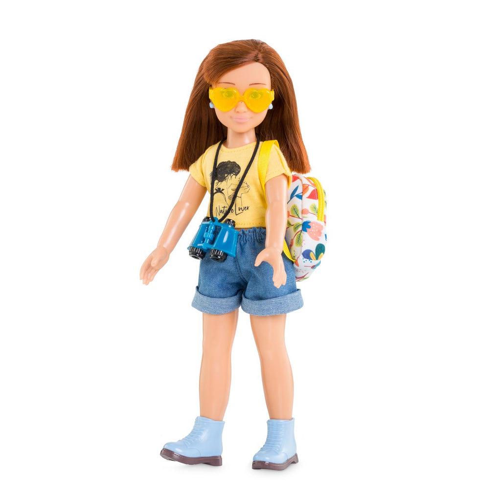Een leuke avontuurlijke outfit voor jouw Corolle Girls pop. Deze set bestaat uit een geel shirt met opdruk, een spijkershort, witte oorbellen, een gele hartjeszonnebril, een blauwe verrekijker, een vloeistof rugzak en lichtblauwe laarzen.