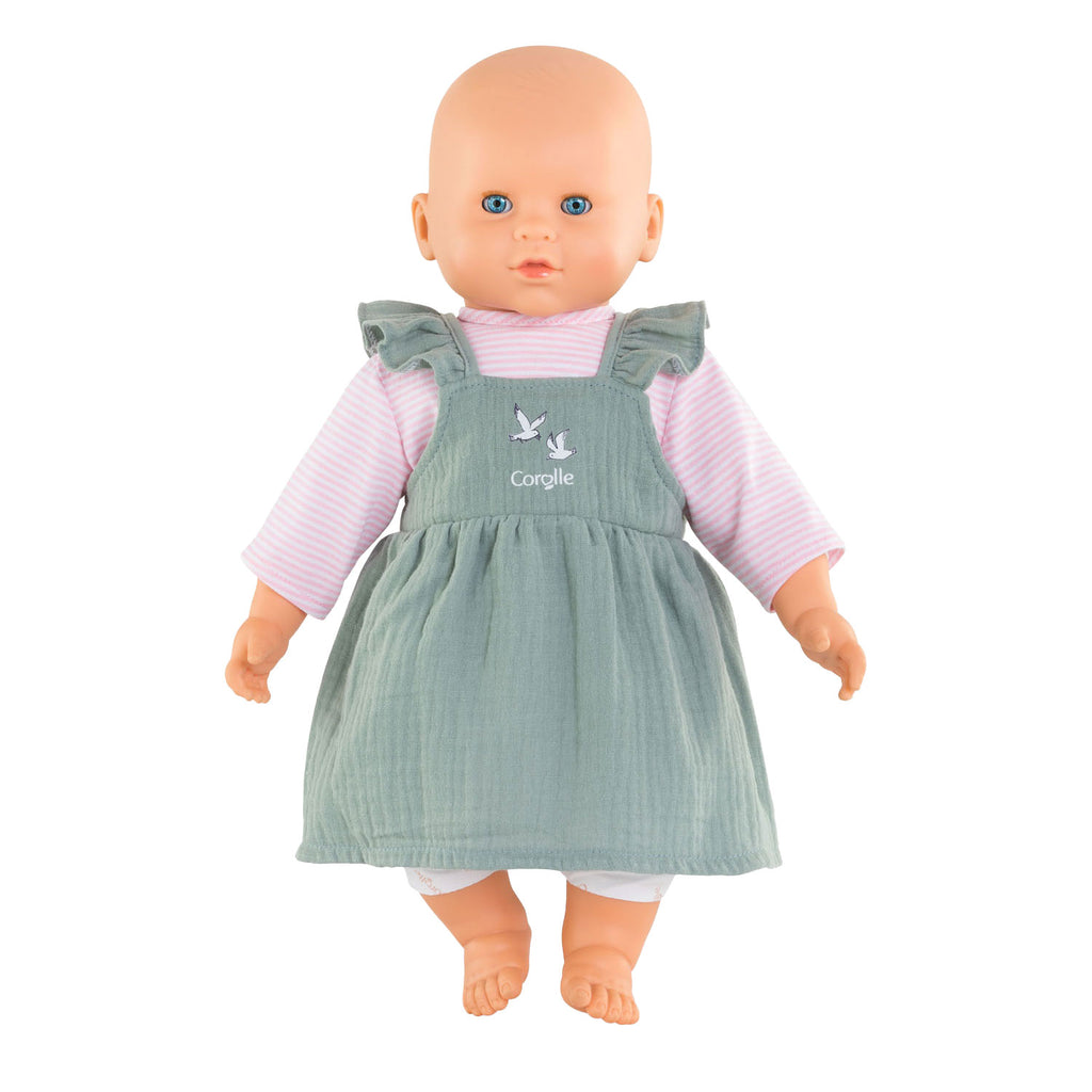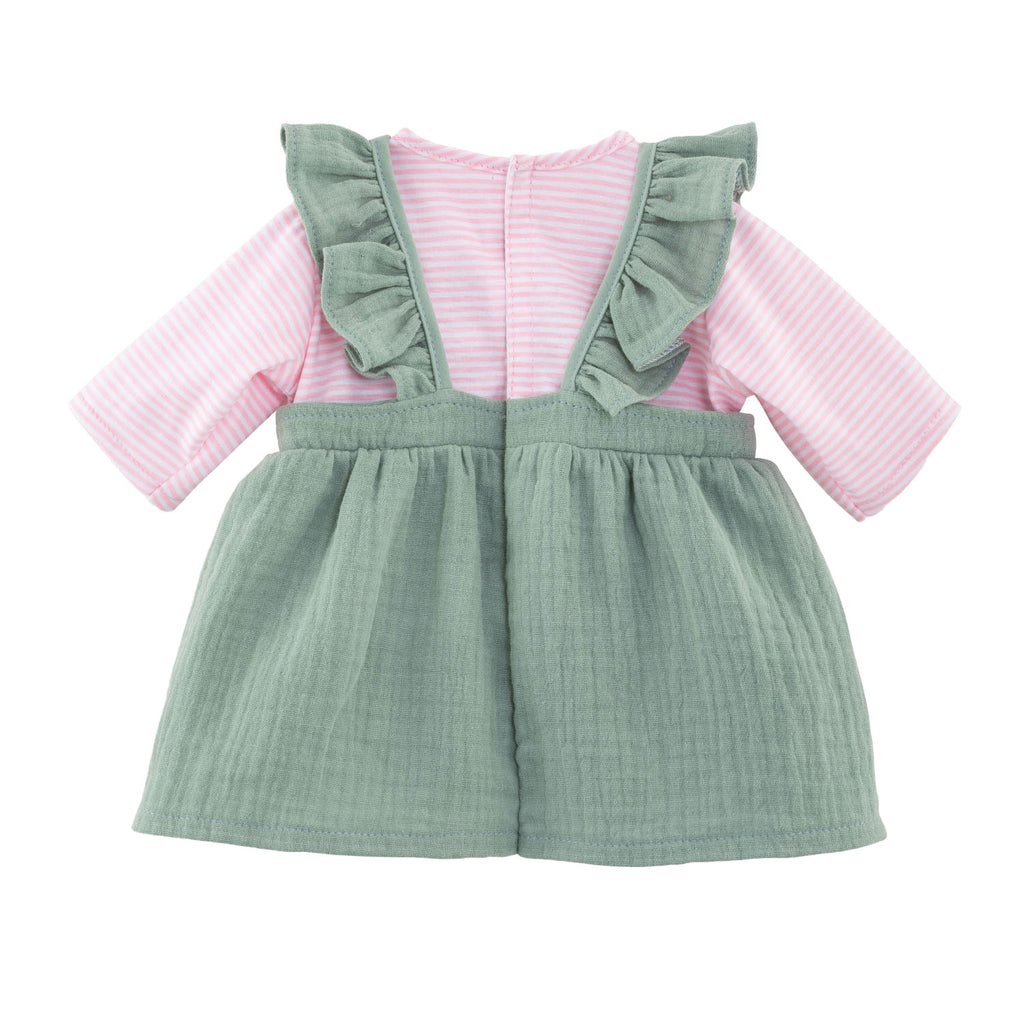 De Bords de Loire jurk met ruches en T-shirt met lange mouwen is een kledingstuk dat perfect is voor grote babypoppen van 42 cm. Deze 2-in-1-outfit bestaat uit een saliegroene jurk van katoen en een roze gestreept T-shirt met lange mouwen, aan de jurk genaaid. Het is gemaakt van zachte en duurzame materialen. 2 kleine meeuwen met print brengen deze mooie outfit tot leven. Hij is gemakkelijk aan te trekken dankzij de klittenbandsluitingen die zijn aangepast aan de behendigheid van de kleine handjes van kinderen vanaf 2 jaar. Dit kledingstuk voor grote babypoppen van 42 cm maakt deel uit van een gevarieerde collectie kleding en accessoires in het Mon Grand Poupon Corolle-assortiment. Deze outfit is speelgoed geschikt voor kinderen vanaf 2 jaar.