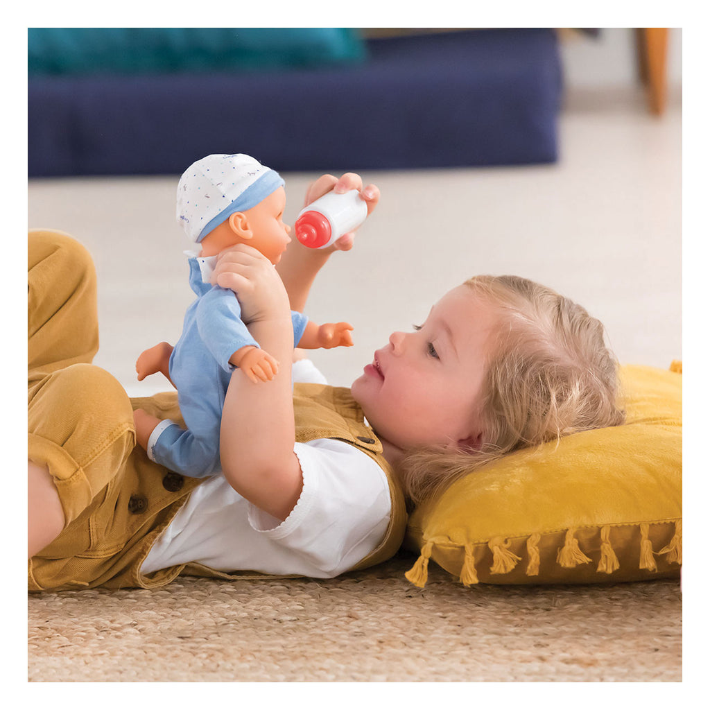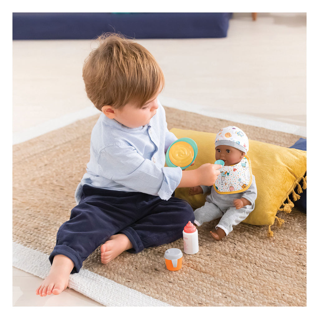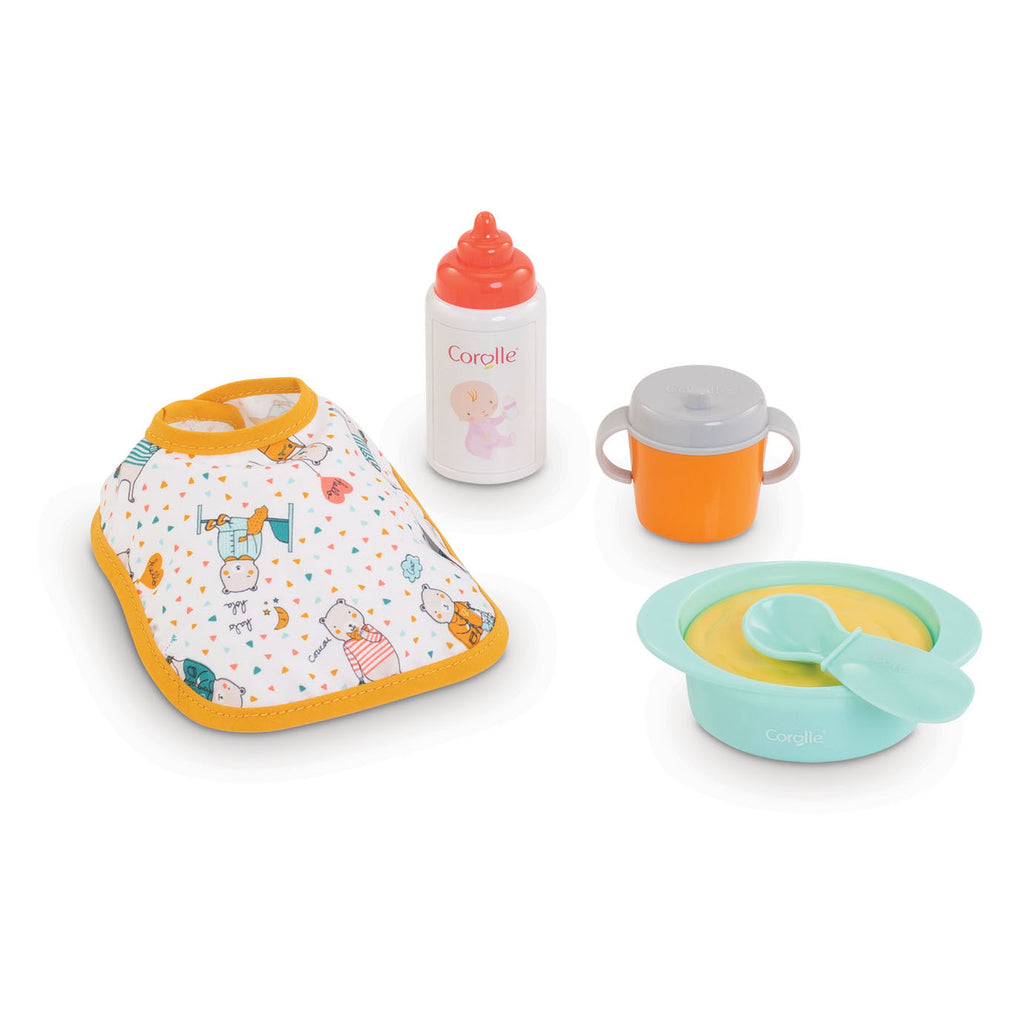 Poppen verzorgingsset met een oranje tuitbeker, een melkflesje, een hapje met een lepel en slab. Geschikt voor de Mon Premier Poupon van Corolle of een pop van ongeveer 30 cm.