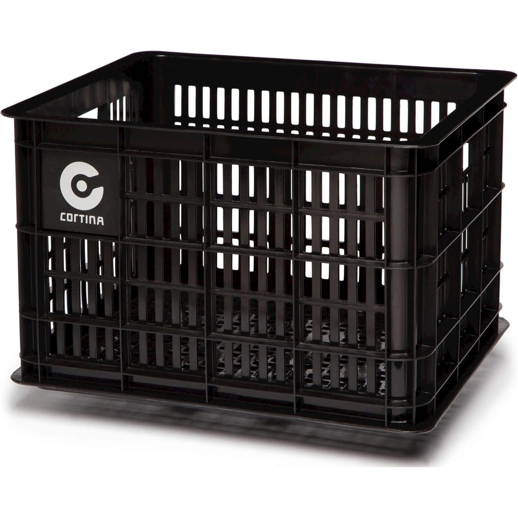 Cortina Krat San Francisco, zwart. Fietskrat met MIK-bevestigingssysteem. Gemaakt van gerecylced petflessen en geproduceerd in Nederland. Voorzien van Cortina-logo. Medium formaat, maximale belading afhankelijk van maximaalbaar gewicht voordrager, inhoud 29,5 Liter, 45 x 35 x 25 cm, Gewicht 1.03 kg.