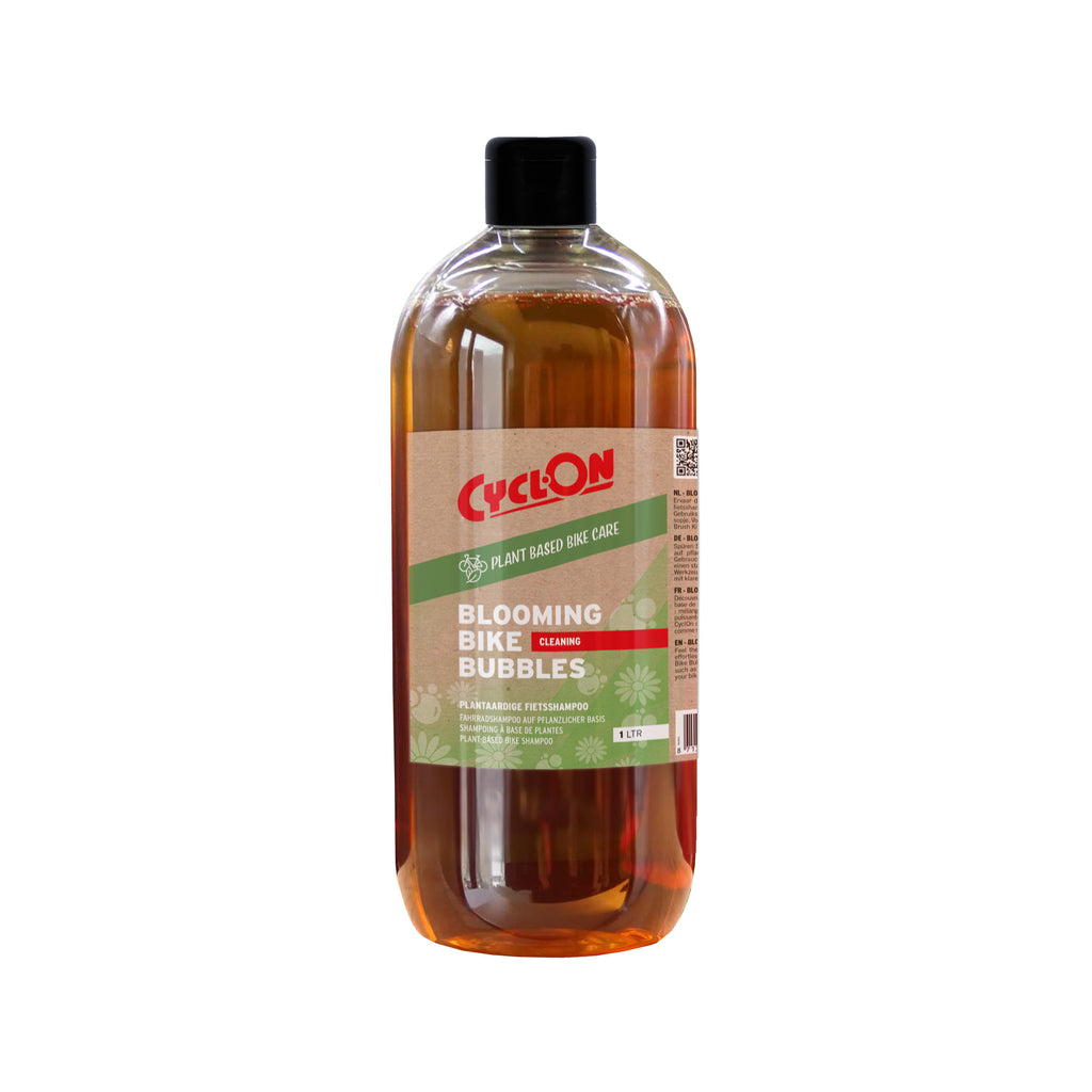 Spoel daarna eenvoudigweg af met schoon water en je fietsstraalt weer als nieuw Ervaar de kracht van de natuur in elke druppel! Onze zinvolle, plantaardige fietsshampoo reinigt moeiteloos het frame en alle onderdelen van je fiets. Gebruiksaanwijzing: Meng 10 ml Blooming Bike Bubbles met 1 liter water voor een krachtig sopje. Voor het beste resultaat gebruik je de juiste tools, zoals de CyclOn Cleaning Glove of Brush Kit. Spoel daarna eenvoudig af met schoon water en je fietsstraal weer als nieuw!