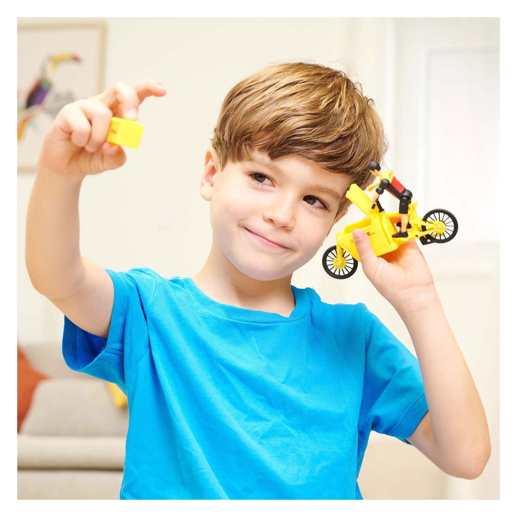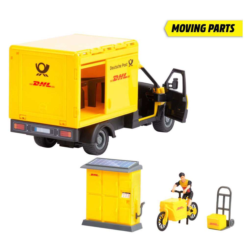Speel het dagelijkse leven van een pakketbezorger na Met de gedetailleerde DHL-pakketvoertuigset kunnen kinderen vanaf 3 jaar in de huid kruipen van een echte pakketbezorger - geholpen door de bijpassende geluiden! Eerst racen de kleine chauffeurs met de e-transporter inclusief speelfiguur & pakketten naar de bezorglocatie, waar ze de schuifdeur van het pakketvoertuig openen, aanbellen en na het overhandigen van het pakket de handtekening van de ontvanger ontvangen. Als ze niet thuis zijn, rijdt de vrijloopwagen eenvoudig naar het dichtstbijzijnde pakstation met zijn verlichting aan en het typische geluid van een elektrisch voertuig. Daar plaatsen de kinderen de pakketten in de scharnierende vakken, laden de auto op bij het laadstation en pakken ondertussen de bakfiets om brieven en pakketten te bezorgen als fietskoerier. Officiële DHL-licentie De voertuigen en accessoires zijn met veel oog voor detail ontworpen in het onmiskenbare gele DHL-design en uitgerust met talloze functies: in de postwagen bevindt zich bijvoorbeeld een transportband die de pakketten gemakkelijk uit de wagen transporteert. Spelend met deze originele speelgoedset leren meisjes en jongens over de processen van de pakketdienst en ontwikkelen ze tegelijkertijd hun fijne motoriek en creativiteit - perfect voor rollenspellen! De benodigde 1,5V R03-batterij is al inbegrepen, zodat de reis direct kan beginnen en alle pakketten op tijd op hun bestemming aankomen! Kwaliteitsspeelgoed van Dickie Toys Als bedrijf met meer dan 50 jaar ervaring in de branche weten we hoe we kinderen van alle leeftijden kunnen inspireren en stimuleren om te spelen. Zelfs de allerkleinsten beginnen al op zeer jonge leeftijd de vele speelfuncties te ontdekken en uit te proberen. Zo traint Dickie Toys de motoriek en zet het de eerste stappen in de verkeersveiligheidseducatie. Of het nu in de kinderkamer is, binnen of buiten, plezier is gegarandeerd met Dickie Toys. Kenmerken • XL pakketdienstset - De DHL-speelset bevat alles wat kleine bezorghelden nodig hebben: een elektrisch voertuig met vrijloopmechanisme, een postbodefiguur, een bakfiets, een pakstation met laadstation en natuurlijk pakketten! • Interactieve functies - Het voertuig en de binnenkant, evenals de fiets en het pakstation, kunnen worden geopend, zodat kinderen vanaf 3 jaar naar hartenlust met het speelgoed kunnen spelen. • Originele DHL-look - De speelgoedauto en alle accessoires zijn rijk gedetailleerd en voorzien van het onmiskenbare gele DHL-design met rode letters - uiteraard met officiële DHL-licentie. • Innovatieve geluiden - Van het openen van de schuifdeuren tot de deurbel en de handtekening bij het overhandigen van het pakket - elk detail van de licht- en geluidseffecten draagt bij aan de imitatie van het dagelijkse DHL-leven. • Dickie Toys - Het voertuigmerk voor kinderen! Kleine racers, grote racers: we hebben altijd één doel voor ogen: een glimlach op kindergezichten toveren. Gewoon uitpakken en het plezier kan beginnen!