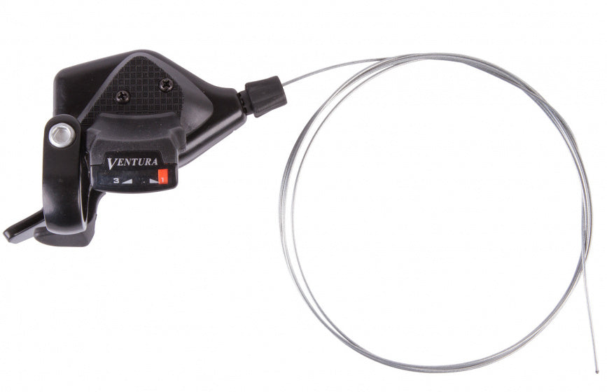 Ventura duimversteller Specificaties: Kleur: zwart Materiaal: aluminium Positie: links Aantal versnellingen: 3 Klemdiameter: 22,2 mm Gewicht: ca. 145 gram Lengte kabel: 2 meter Inhoud: 1 Duimversteller links 1 Binnenkabel