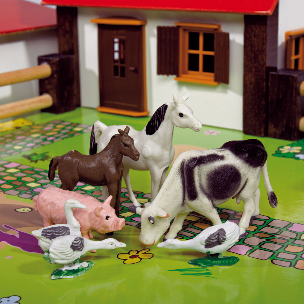 Houten boerderij met dieren figuren van Eichhorn met: plaat (38x35 cm) met boerderijhuis, stal en hekken, koeien, een paard, veulens, varkens, ganzen en een boer.