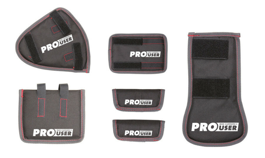 De fietsbeschermers van Pro-User fietsendragers beschermen de fiets tegen belangrijke transportschade bij vervoer op een fietsendrager. Ook zorgt voor een beschermd transport van de fiets in de auto, caravan of aanhanger. De set van fietsbeschermers bestaat uit de volgende onderdelen: Voorvorkbeschermer, Pedaalbeschermer, Kettingkast of derailleur beschermer, Velgbeschermer (2x), Universele beschermer (frame of stuur) De beschermers zijn universeel bruikbaar, voor dames- en herenfietsen, e-bikes, mountainbikes en racefietsen. Door het klittenband en soepele materiaal zijn de beschermers gemakkelijk te bevestigen. De beschermers zijn waterafstotend en eenvoudig schoon te maken. Geleverd inclusief opbergtasje voor het opbergen netjes van de set. De fietsbeschermers van Pro-User fietsendragers beschermen de fiets tegen belangrijke transportschade bij vervoer op een fietsendrager. Ook zorgt voor een beschermd transport van de fiets in de auto, caravan of aanhanger. Geleverd inclusief opbergtasje voor het opbergen netjes van de set. Het ideale bescherming De beschermers zijn universeel bruikbaar, voor dames- en herenfietsen, e-bikes, mountainbikes en racefietsen. Door het klittenband en soepele materiaal zijn de beschermers gemakkelijk te bevestigen. De beschermers zijn waterafstotend en eenvoudig schoon te maken. Specificaties: Kleur: donkergrijs Materiaal: waterafstotend textiel Sluiting: klittenband Geschikt voor: fietsendragers van Pro-User Geschikt voor e-bikes: ja Gewicht: ca. 0,15 kg Inhoud: 1 Voorvorkbeschermer 1 Pedaalbeschermer 1 Kettingkast of derailleurbeschermer 1 Universele beschermer (frame of stuur) 2 Velgbeschermers 1 Opbergtasje