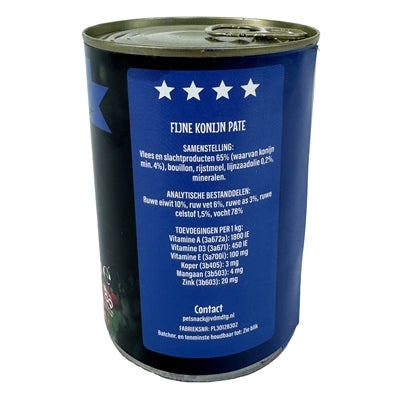Samenstelling: Vlees en slachtproducten 65% (waarvan konijn min. 4%), bouillon, rijstmeel, lijnzaadolie 0,2%, mineralen