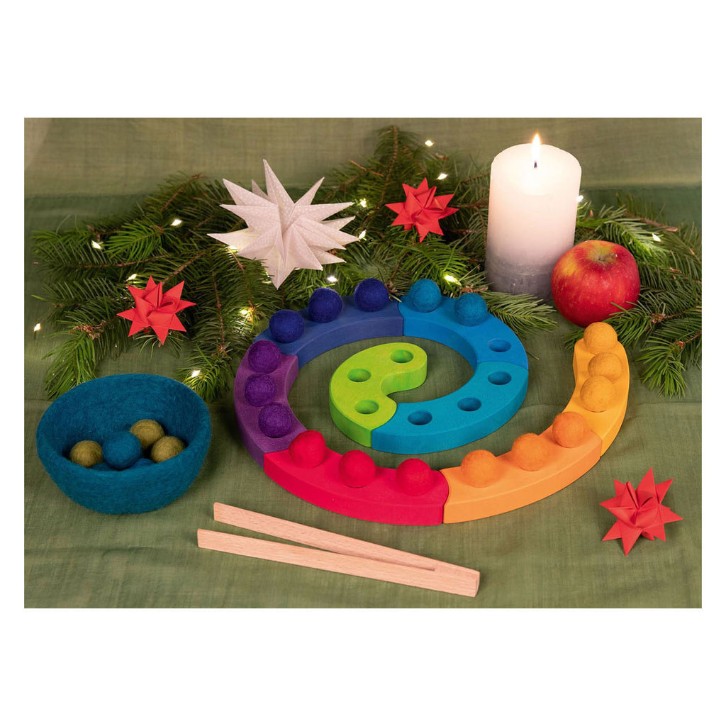 Hoe gaaf is dit multifunctionele sorteerspel van Goki! Je zet de 8 hoorstukken gemakkelijk aan elkaar. Daarna kan je met de houten tang de wollen balletjes oppakken en op de juiste kleur leggen. Zowel de hand-oogcoördinatie als de concentratie wordt grotendeels veranderlijk. Naast de spelfunctie kan je deze spiraal ook gebruiken als adventskalender om af te tellen richting kerst. Geschikt voor kinderen vanaf 3 jaar.