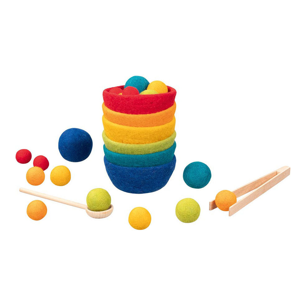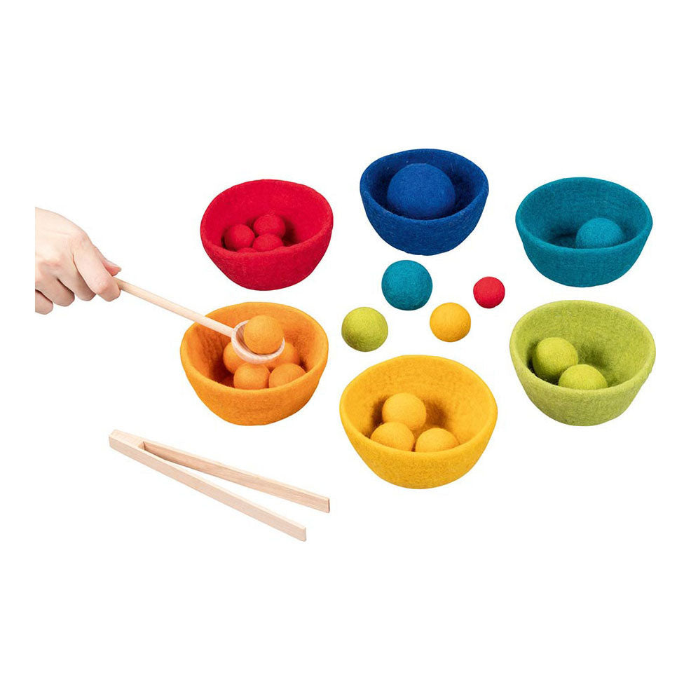 Kleur sorteerspel. Plaats de juiste kleur ballen in het juiste kommetje. Tel daarna het aantal balletjes in de bakjes. Je traint je motoriek als je de balletjes met de messenmaker of de lepel in en uit de bakjes haalt. Geschikt voor kinderen vanaf 3 jaar oud.