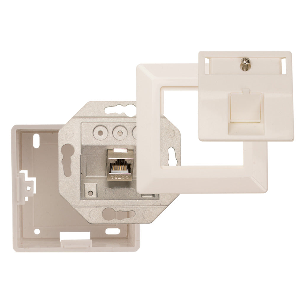 - Verpakkingsinhoud: opbouwframe, één CAT6A keystone, voorplaat met sluiter