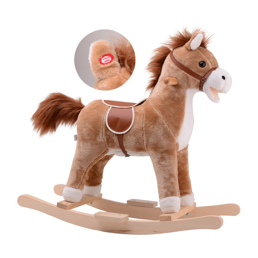Met dit mooie pluche hobbelpaard kun je uren plezier beleven. Als je in z'n oren knijpt maakt hij echt geluid en waggelt hij met z'n staart. Het paard heeft een hoogte van 64 cm en het maximale draaggewicht is 40 kg. Werkt op 3 AA-batterijen (niet inbegrepen).