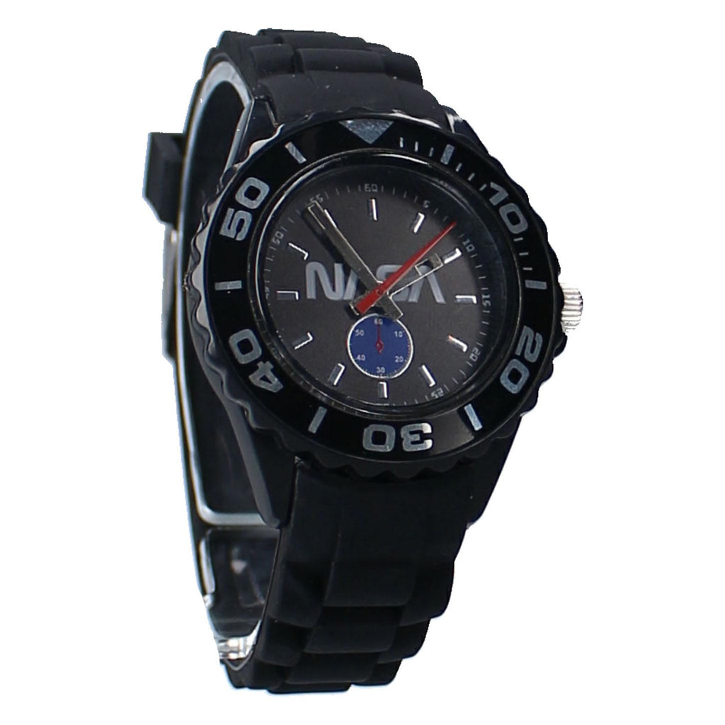Met dit leuke horloge van NASA uit de Kids Time collectie komt je nooit meer te laat op school of bij de sportles. De bandjes van het horloge zijn zwart. Het horloge heeft een zwarte wijzerplaat met het NASA-logo. De grote en kleine wijzer zijn rood en de secondewijzer is door de witte kleur ook duidelijk zichtbaar. Bovendien is het horloge ook erg leuk om cadeau te geven!