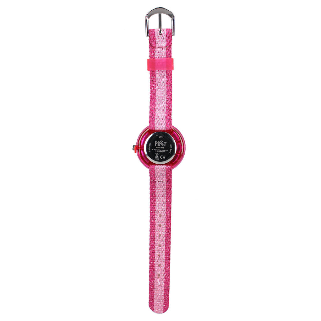 Roze horloge met glitters en een hoorn op het klokje. Kinderen kunnen zo op een leuke manier oefenen met klokkijken. Het horloge is geschikt voor kinderen vanaf 3 jaar.