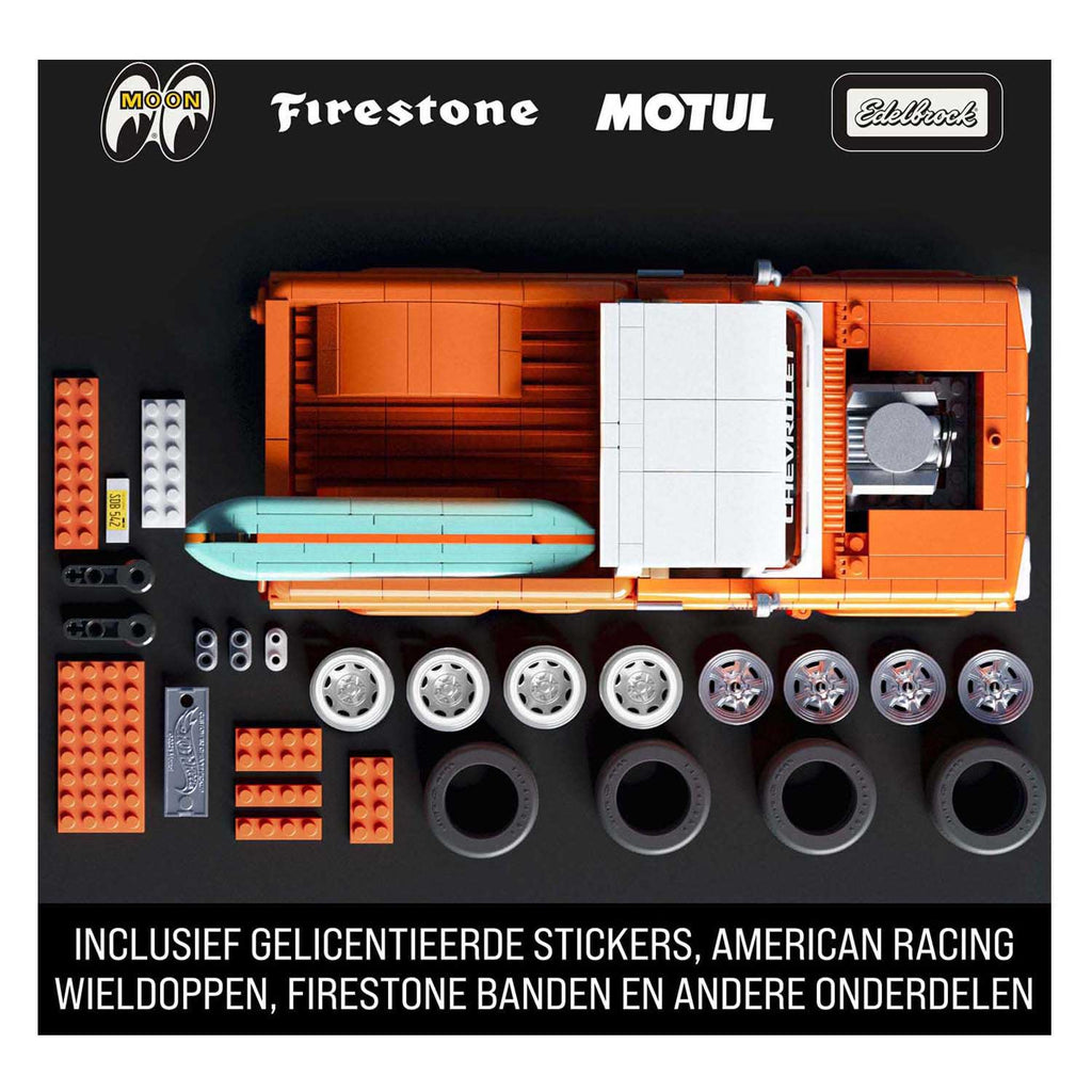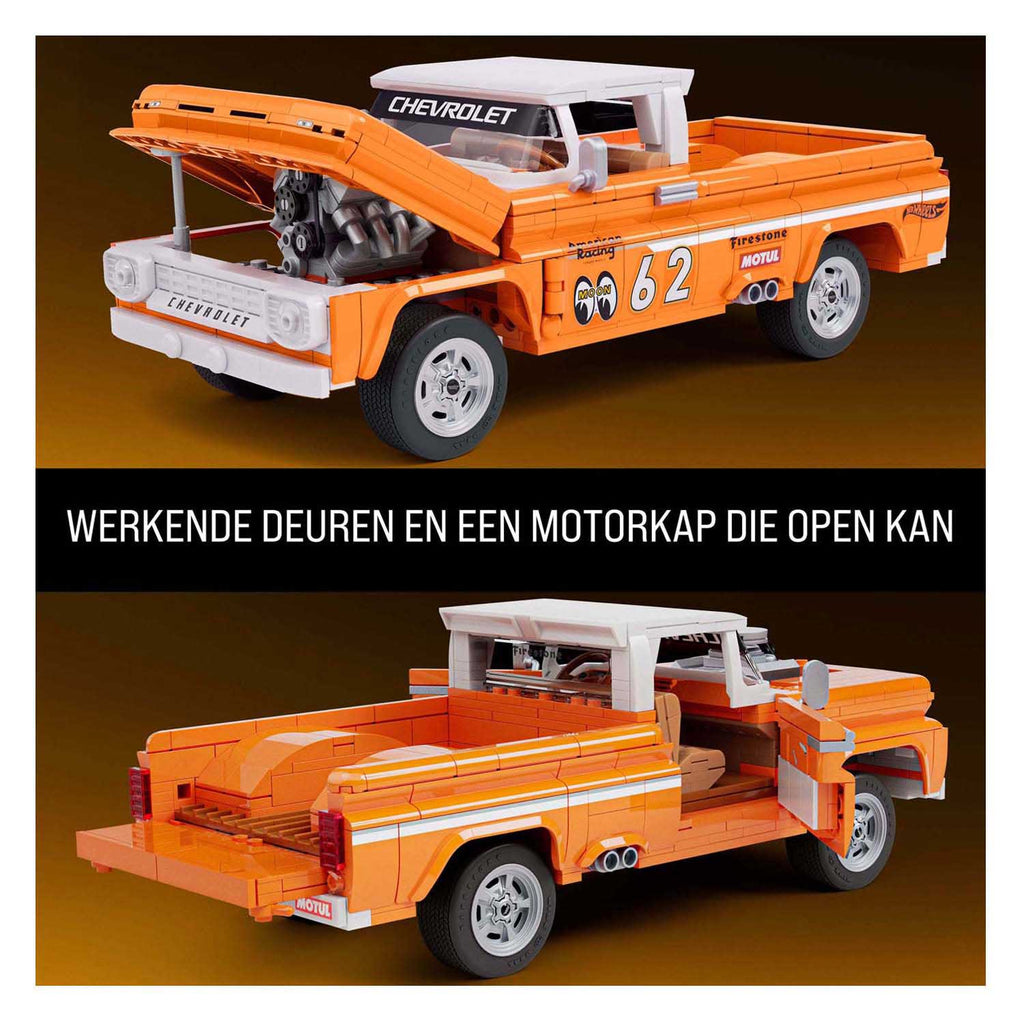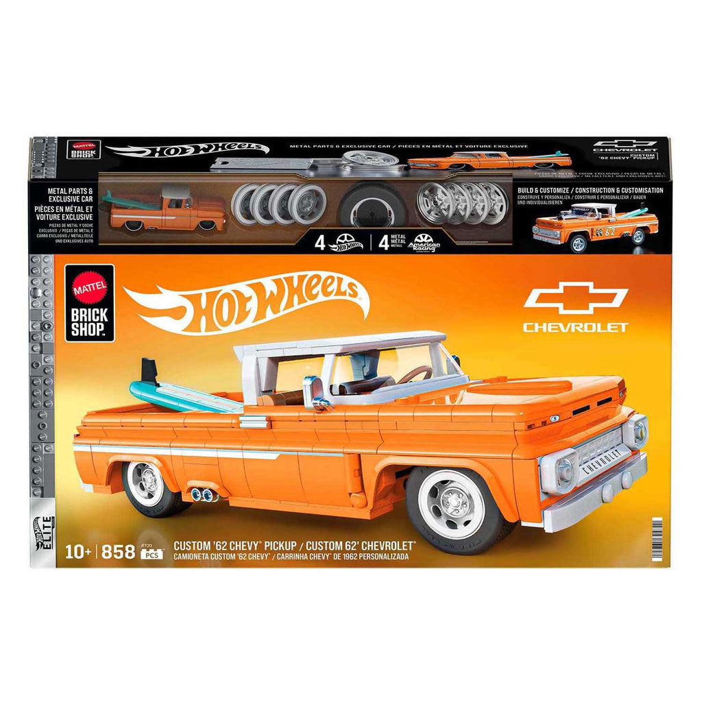Riemen vast en de snelweg op met de volledig bouwbare Custom '62 Chevy Pickup (schaal 1:16) van Mattel Brick Shop. Deze gedetailleerde en authentieke set bevat extra onderdelen die je naar eigen inzicht kunt gebruiken, waaronder een zichtbare motor, een stickervel, metalen wieldoppen, een merkplaatje en een exclusieve bijpassende metalen auto. Leuk om te verzamelen en tentoon te stellen. Verzamel alle auto's uit de Elite Serie en bouw je eigen garage vol.