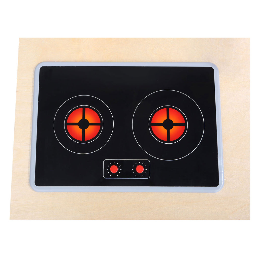 Houten keukentje met kookplaat, oven, keukenkastje, wasbak met kraan, kookgerei en klok. Geschikt vanaf 3 jaar.