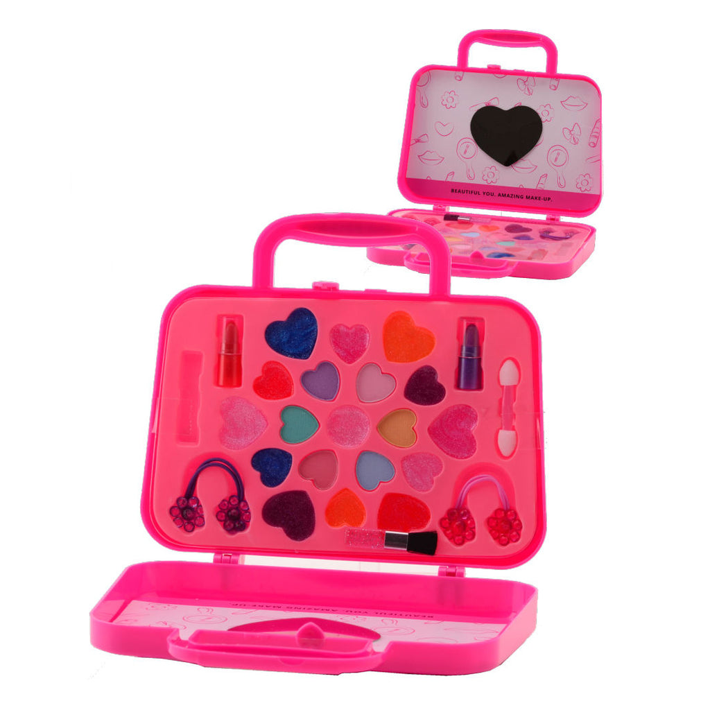 Een prachtige koffer gevuld met verschillende kleuren lipgloss en oogschaduw in hartjesvorm en lippenstift. Deze koffer is perfect voor kinderen vanaf 5 jaar. Het bevat ook twee haarelastiekjes met bloemetjes en een handige spiegel. Laat de creativiteit van je kinderen bloeien met deze leuke make-upset!