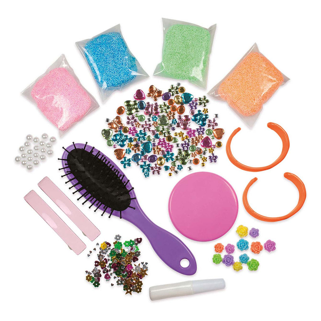 Versier je eigen beautyset met Jill Schirnhofer! Ontwerp samen met Jill Schirnhofer jouw mooiste beautyset! Versier een haarborstel, een spiegeltje, armbanden en haarclipjes met glitter foamklei. Laat je creaties schitteren met steentjes, pailletten, mooie bloemen en parels! Kenmerken: �?�Versier stap voor stap jouw eigen beauty set, voor meisjes en jongens vanaf 8 jaar �?��??Versier je eigen beauty set�?� stimuleert de creativiteit en ontwikkeling van de fijne motoriek �?�Unieke knutselbox die alle materialen bevat die je nodig hebt om jouw eigen haarborstel, spiegeltje, armbanden en haarclipjes te ontwerpen! Over Jill Jill Schirnhofer is sinds 2014 bekend als illustrator, schrijver, programmamaker en actief als actrice. Het stimuleren van kinderen om zelf creatief aan de slag te gaan heeft ze altijd belangrijk gevonden. �??Het is niet alleen een goede uitlaatklep, het helpt kinderen ook om tot roest te komen en zelfs aan niets te denken�??. Bij deze box heeft ze gekozen voor een vrolijk, eenvoudig te maken knutselidee dat kinderen zullen inspireren om hun creativiteit erop los te laten en eigen kaarten te ontwerpen! Inhoud: �?�4 pakjes glitterfoamklei in verschillende kleuren �?�1 haarborstel �?�1 spiegeltje �?�2 armbanden �?�2 haarclipjes �?�Meer dan 120 verschillende foam parels �?�12 verschillende kunststof bloemen �?�20 decoratieparels �?�Pailletten �?�Lijm �?�Instructieboekje