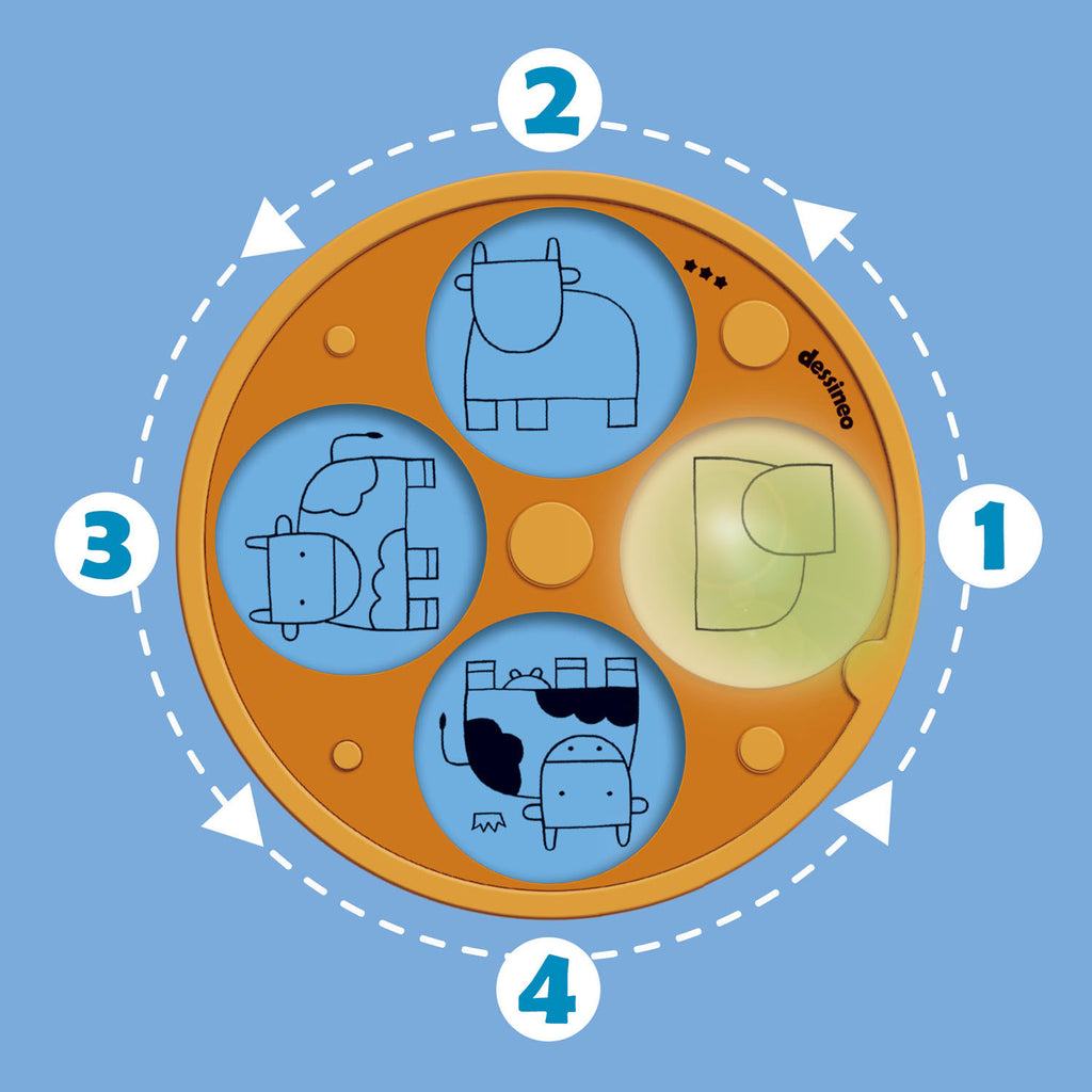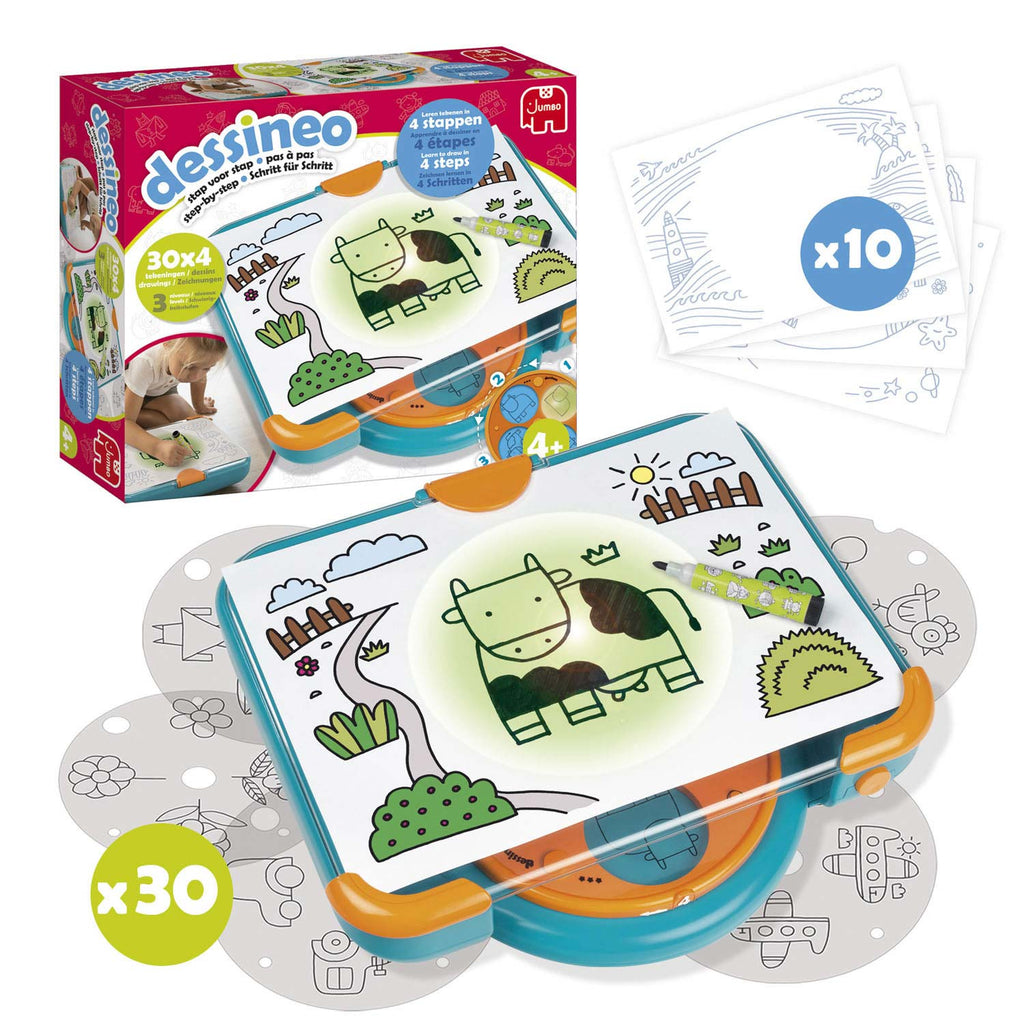 Mijn eerste spel om te leren tekenen! Dessineo is speciaal ontworpen voor kinderen van 4 jaar en ouder. Het soort leert op een eenvoudige en leuke manier stap voor stap tekenen. Met eenvoudige vormen zoals een cirkel, vierkant en driehoek, tekent het kind een poes, kerstman, vliegtuig... De tekenvellen zijn al voorbedrukt met inspirerende achtergronden: een zee voor de vis, het heelal voor de raket en een sneeuwlandschap voor de kerstman! Het spel stimuleert de creativiteit en fantasie van het soort. Leren tekenen in 4 stappen. Kies een van de transparante sjabloonschijven en leg deze in de draaischijf. Bijvoorbeeld de vis. Zet de projector aan. Kies een van de achtergrondbladen (bijvoorbeeld de zee) en een been dat op het transparante deksel van de projector tussen de vier bevestigingspunten zit, zodat het blad goed blijft liggen. 1. Draai de schijf met het tekensjabloon naar cijfer 1. De eerste stap van de tekening wordt nu geprojecteerd: een grote ovaal voor het lichaam en 2 boogjes voor de vinnen. Trek de eerste lijnen over met de stift. 2. Draai de schijf naar de stap 2 en teken het hoofd, de grote vin en de staart. 3. Teken in stap 3 het oog, de mond en de strepen, en kijk: er is een vrolijke vis verschenen! 4. In stap 4 komen er nog belletjes, een zeester en een klein visje bij. Tot het slot kan de tekening niet worden gekleurd. Alles kan netjes worden opgeborgen in de tekentafel. De tekentafel heeft een handvat, zodat je het overal mee naartoe kunt nemen. - 1 tekentafel met draaischijf en projectorlamp - 30 tekensjablonen op 3 verschillende niveaus - 10 achtergrond Inhoudbladen A4 - 1 zwarte stift.