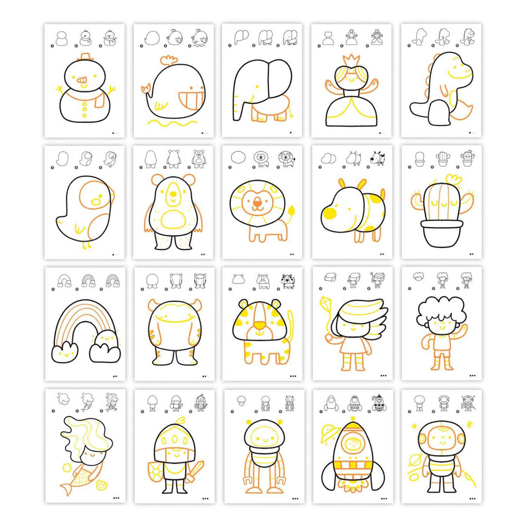 Het kind kiest een modelblad en legt het op de tablet. Ze draaien de knop naar positie 1: de eerste stap verschijnt op hun lege vel. Ze tekenen met een marker, draaien vervolgens de knop naar positie 2, dan 3. Ten slotte kleuren ze hun tekening zoals ze willen. Met opbergruimte aan de achterkant voor de bladen en een handvat om het overal mee naartoe te nemen!