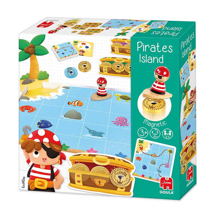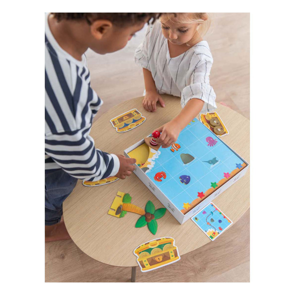 Vaar tot aan het eiland en zoek de goudstukken. Spelbord, 1 piraat (met magneet), 10 houten stukjes, 4 kisten en 20 kaarten.