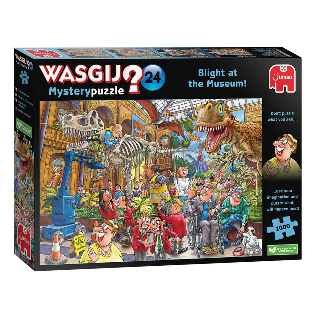 Deze prachtige dinosaurussen zijn ooit over de aarde gegaan, maar nu verblijven ze in het museum, waar experts proberen hun skeletten zorgvuldig te conserveren en er zo angstaanjagend mogelijk te laten zien. Wordt de tentoonstelling een succes, of is één dom foutje genoeg om zelfs de opgezette prehistorische dieren op hol te doen slaan? Gebruik je verbeelding en de aanwijzingen op de doos om uit te puzzelen wat er nu gaat gebeuren. Dat is het beeld dat jij puzzelt.