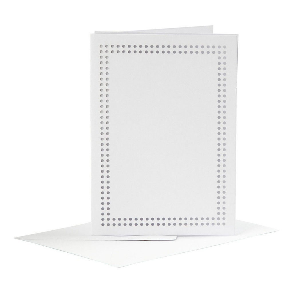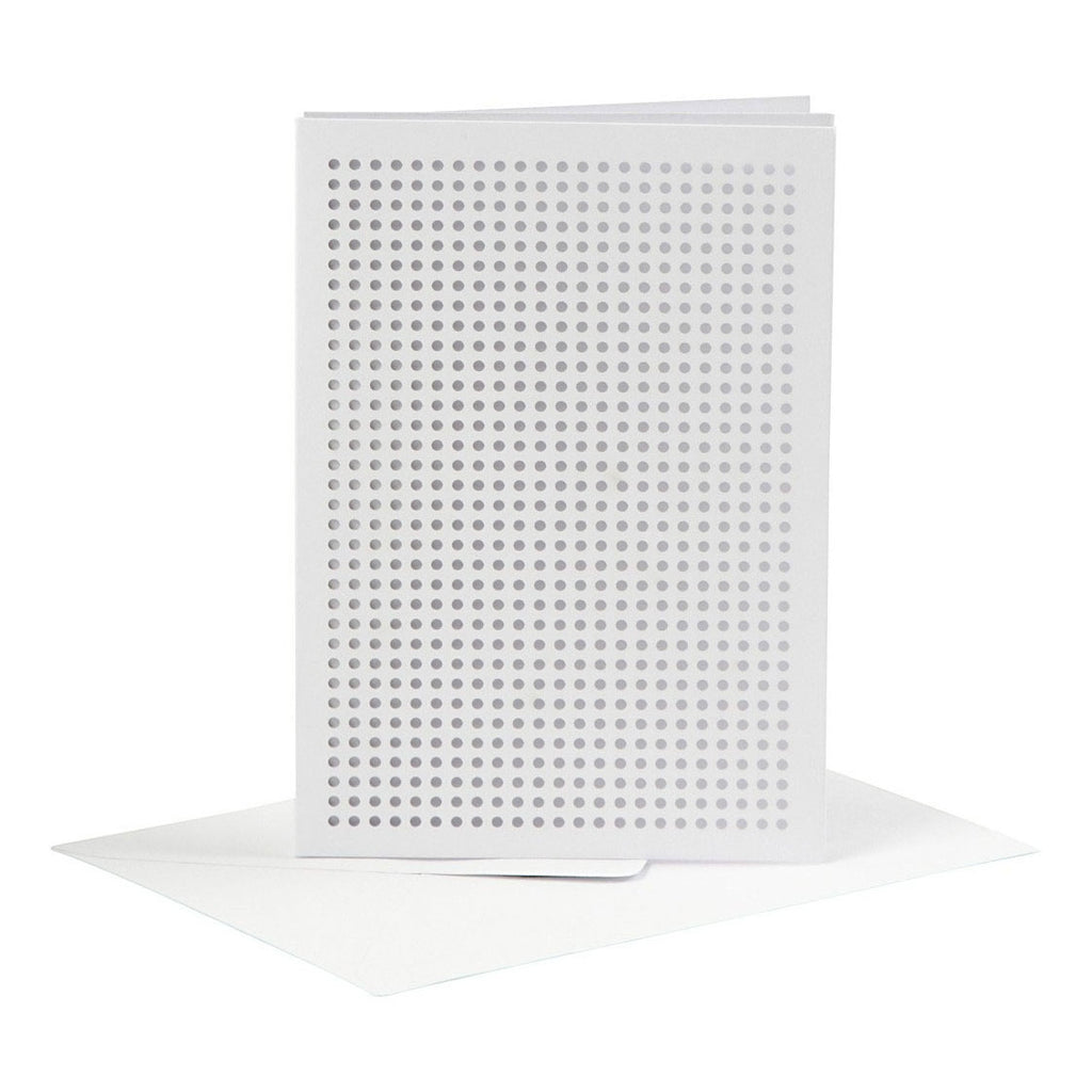 Dubbele kaarten van stevig karton (300 gr) met gaten om te borduren. Bijpassende papieren enveloppen (120gr) met gomsluiting. Inclusief achterkant voor het identiek.Set met 2 verschillende ontwerpen, van elk 3 stuks en 6 identieke enveloppen