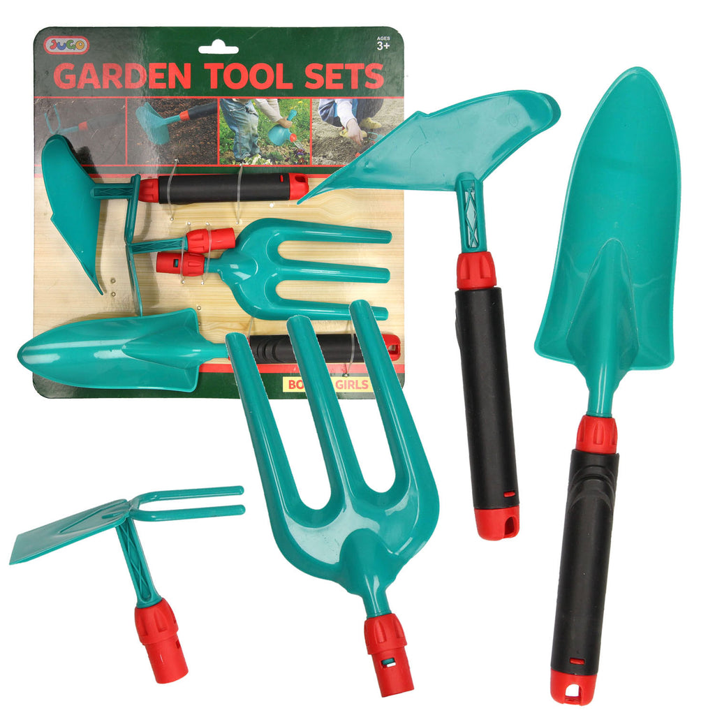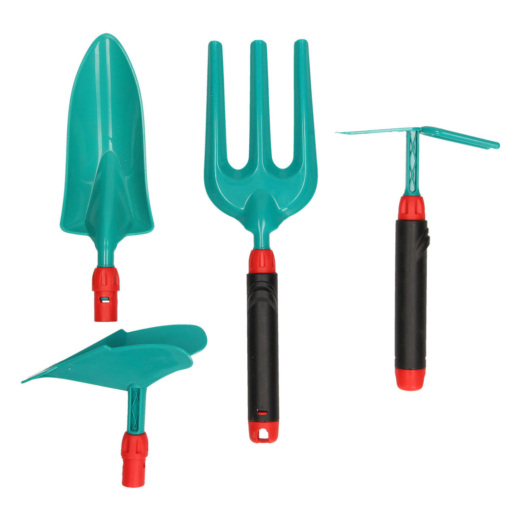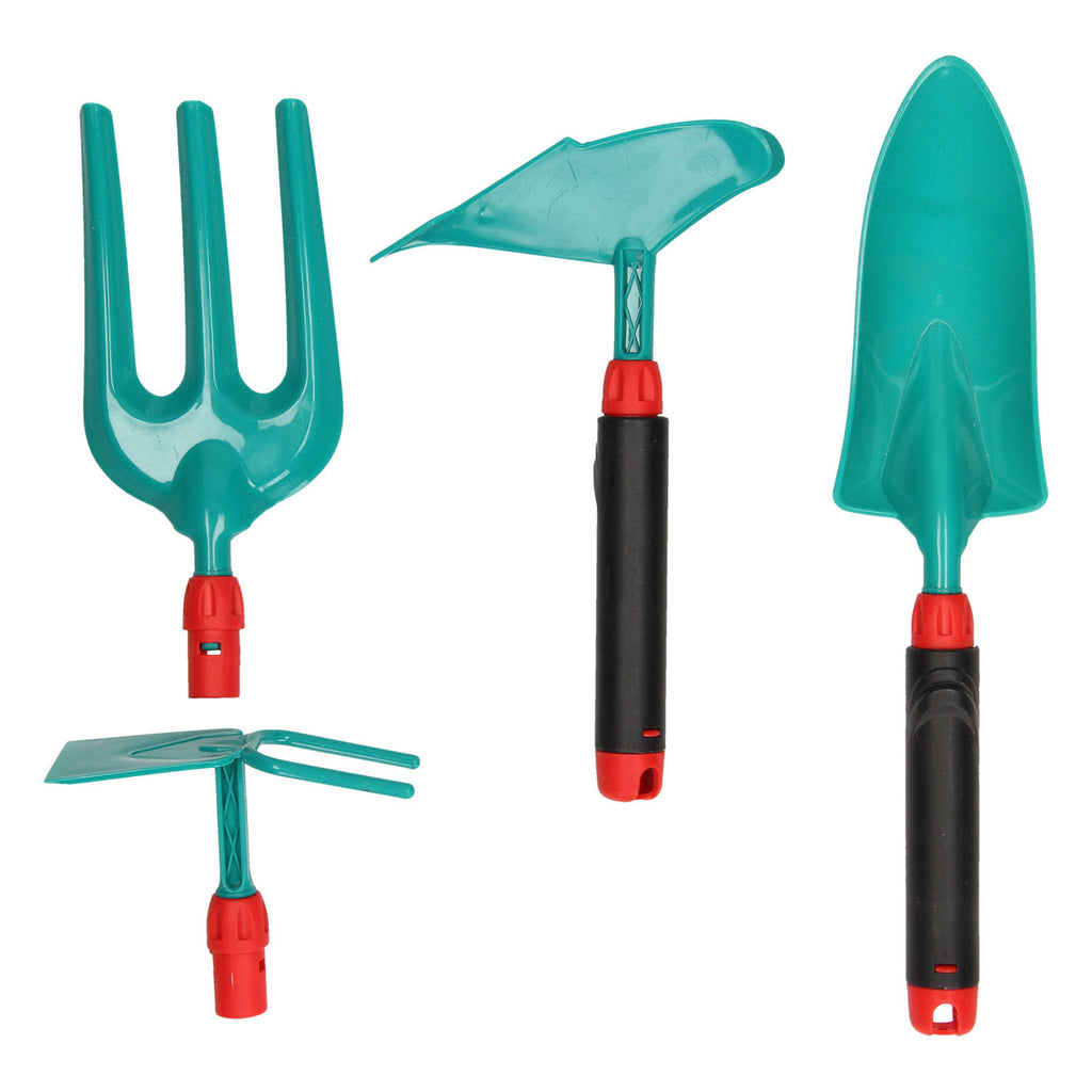 4 stuks tuingereedschapset voor kinderen. 2 handvatten en 4 opzetstukken. Gemaakt van kunststof. Geschikt voor kinderen van 3 tot 6 jaar oud.