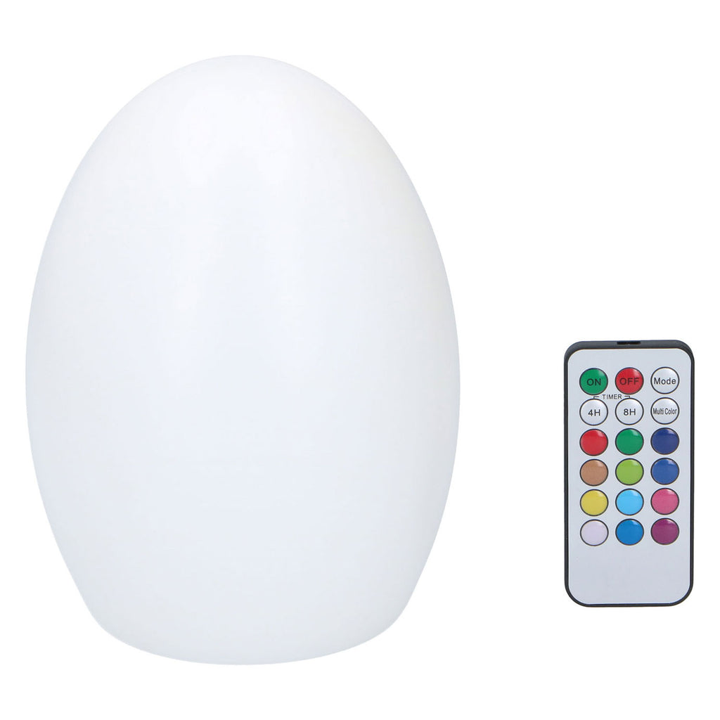 Kleurveranderende nachtlamp in de vorm van een ei. De lamp is 18 x 13,8 centimeter groot en heeft een afstandsbediening waarmee je tot wel 12 verschillende kleuren licht kunt instellen. De nachtlamp werkt met ledlicht en bevat een tijdschakelaar en verschillende standen (kleurveranderend, rustige overgang of stabiele kleur). Werkt op 3 AAA-batterijen, deze zijn niet inbegrepen.