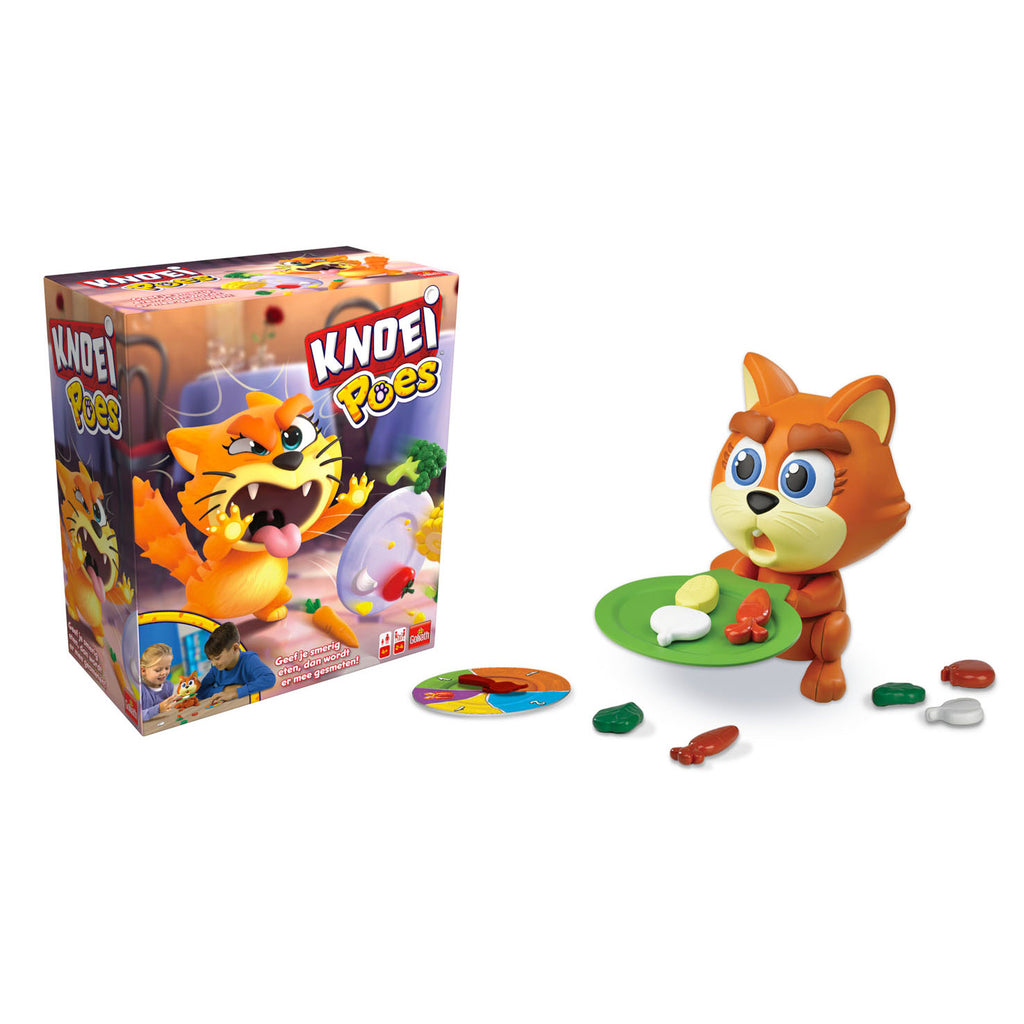Groenten zijn goed voor je, maar daar denkt Knoeipoes anders over! Raak je groenten als eerste kwijt en win, maar te veel groenten op haar bord en ze gooit alles overboord! Verdeel de groenten aan het begin van het spel over alle spelers en zet Knoeipoes rechtop in haar lieve positie. Nu leggen de spelers een voor een waarschuwing de groenten op het bord van Knoeipoes. Met elk stuk groente wordt het bord krachtig en wordt Knoeipoes wat bozer. Leg jij nu het laatste stuk neer waardoor het bord te zwaar wordt? Dan gooit ze het hele bord de lucht in! Nu moet jij 2 stukken groenten extra pakken. Zet vervolgens Knoeipoes weer terug in de startpositie en speel verder. Degene die als eerste alle groenten kwijt is, wint!