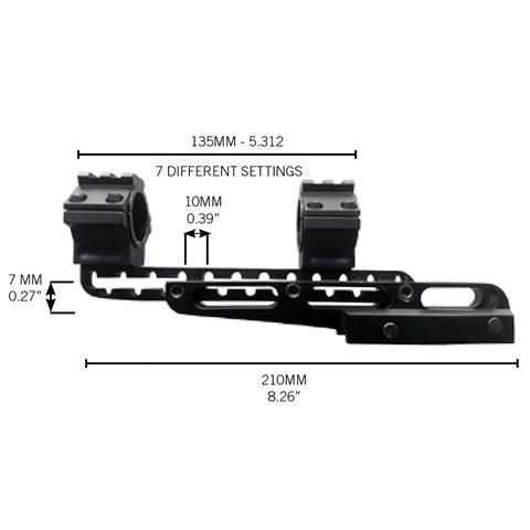 Si vous souhaitez placer la lunette de visée vers l'avant, les trois vis peuvent être retirées à l'aide de la clé Allen fournie. Après cela, le Konus Cantilever Assembly Universal peut être réglé sur 7 positions différentes, après quoi vous resserrez les deux vis extérieures. Si l'ensemble devient trop lourd à l'avant et que l'ensemble n'est pas confortable à tenir, l'ensemble peut être repoussé à volonté. Ensuite, serrez correctement toutes les vis et le Konus Cantilever Assembly Universal est prêt à l'emploi.