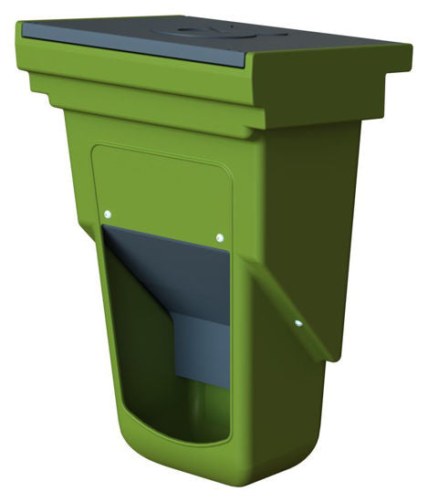 Productomschrijving Voerbox voor kalverhutten, gecombineerd voeren van hooi en krachtvoer - Met kunststof ophanghaken - Van buitenaf te vullen - Met gemoffeld deksel wat beschermd tegen de regen - Stabiele uitvoering van kunststof - Afmeting: H510 x B330 x D270mm - Met gemoffelde blik-inzet voor het voeren van krachtvoer, 10L
