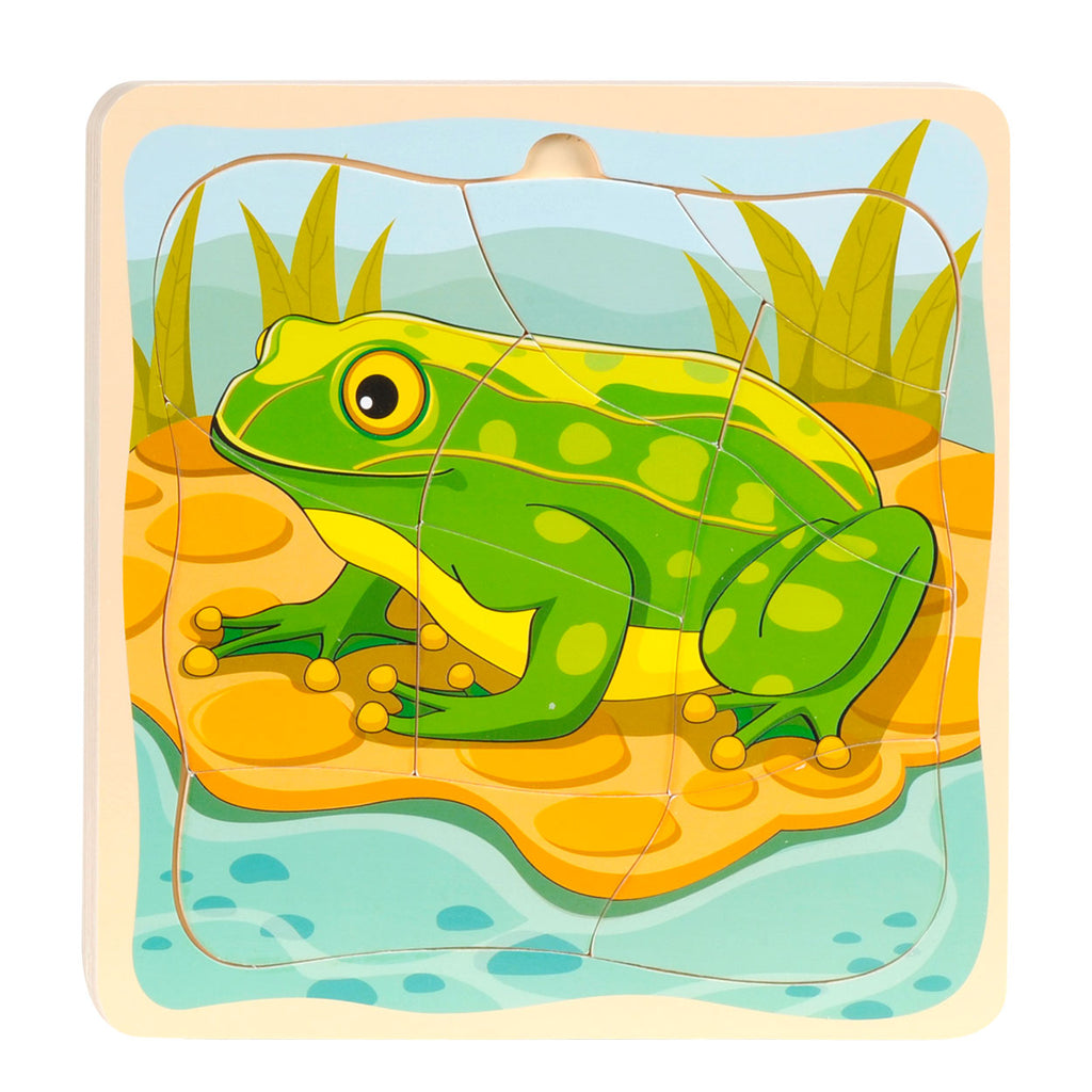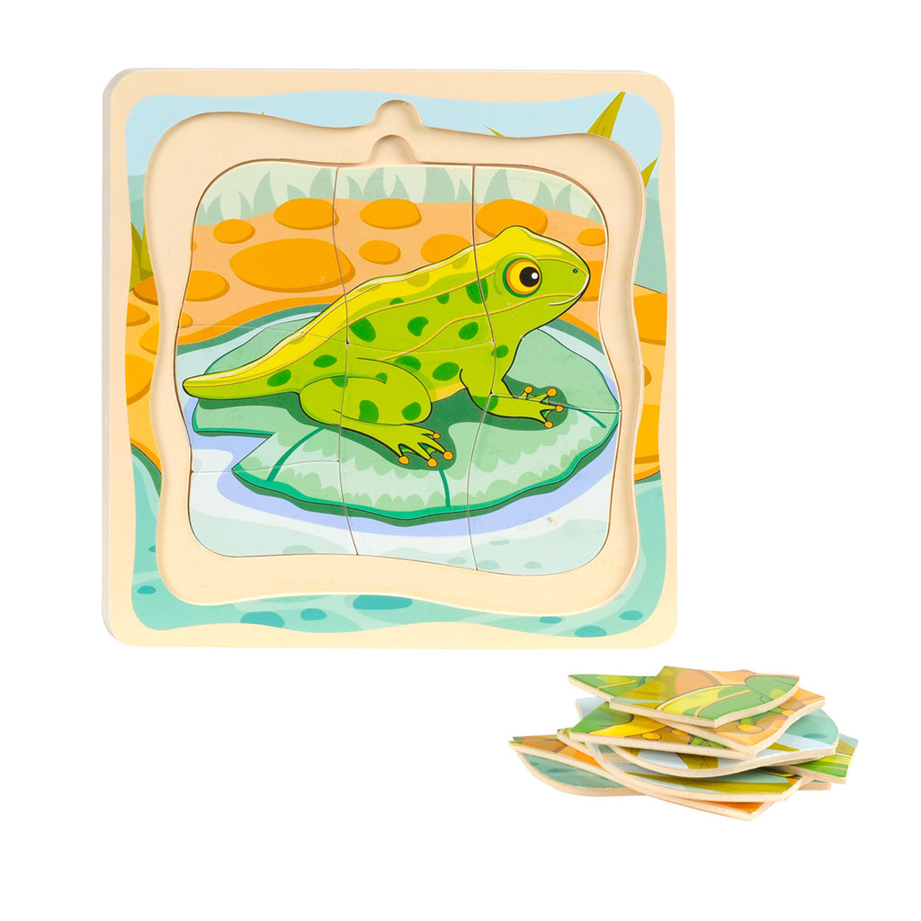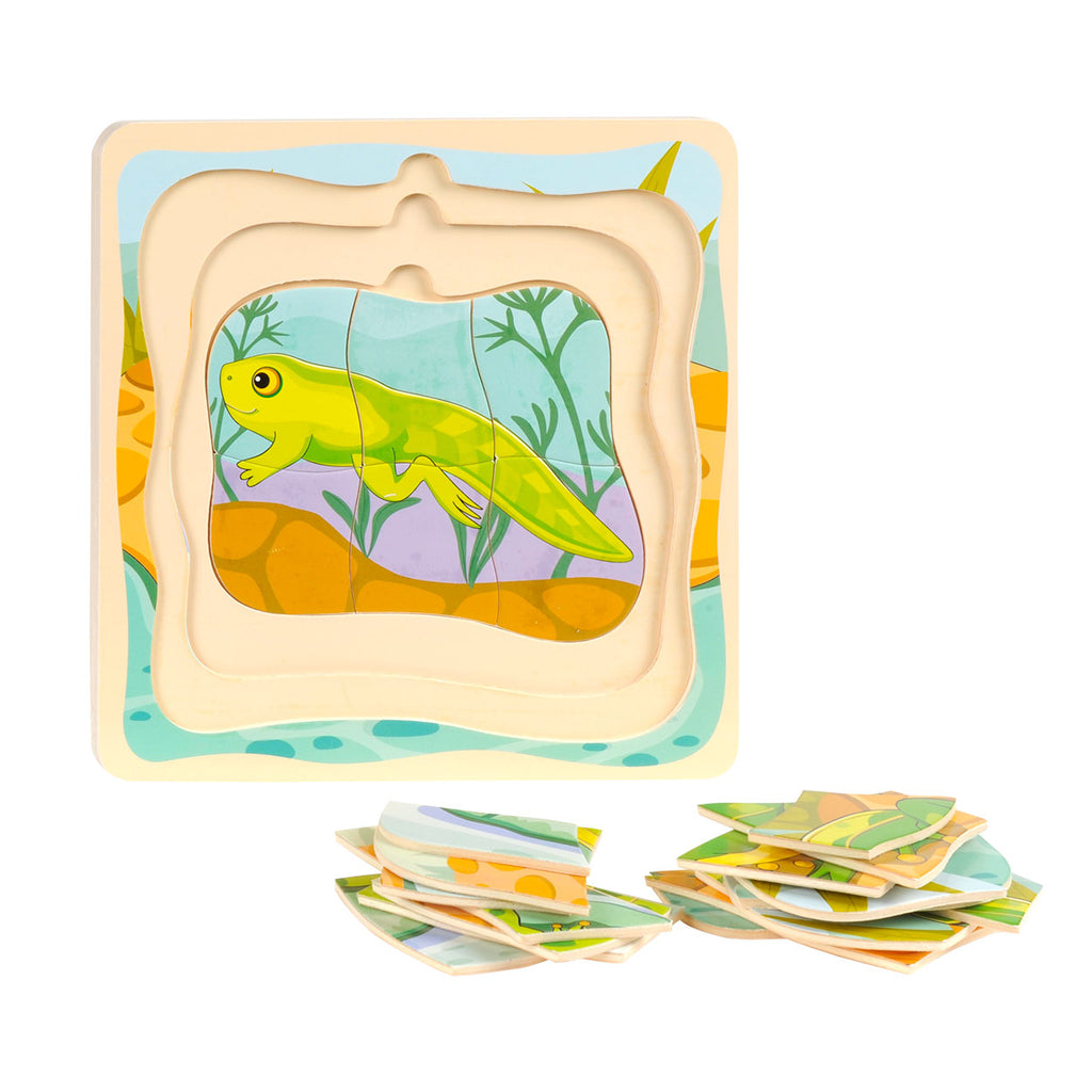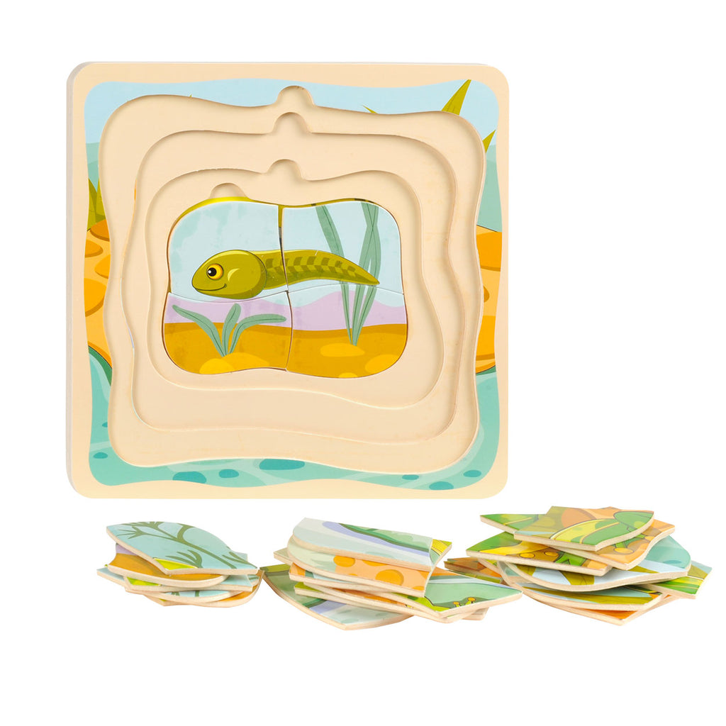 Houten de puzzel bestaat uit vijf lagen. Maak met de vier verschillende puzzels van de groeicyclus van de kikker compleet!