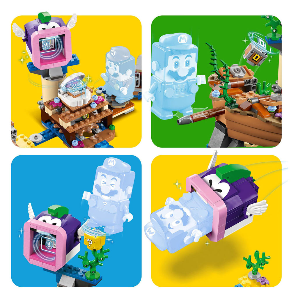 Creëer een spannend LEGO Super Mario onderwaterlevel voor een schattenjacht met de Uitbreidingsset: Dorries gezonken scheepswrak (71432). Rijd op een Dorrie met een interactieve LEGO Mario, LEGO Luigi of LEGO Peach figuur (figuren niet inbegrepen) en verken het scheepswrak. Let op: voor interactief spelen is de startset 71360, 71387 of 71403 vereist. Dit kinderspeelgoed wordt geleverd met 4 bouwbare LEGO Super Mario poppetjes: personages Dorrie, een Cheep Cheep, Cheep Chomp en Blooper. Draai aan het platform om het sleutelblok om te ontdekken dat verborgen in de schelp zit en open de schatkist om de edelsteen te pakken. Het ?-blok biedt willekeurige beloningen en de Cheep Chomp kan op een interactieve figuur in zijn mond kauwen voor leuke digitale reacties. Deze Mario-speelgoedset is een leuk cadeau voor gamers die houden van rollenspellen en de Super Mario-spellen. In de LEGO Super Mario app vind je de bouwinstructies. De app biedt kinderen daarnaast creatieve bouw- en speelideeën en een veilige omgeving waar ze hun creaties kunnen delen.Afmetingen: deze set is ca. 17 cm hoog, 30 cm breed en 21 cm diep in de basisopstelling en kan op verschillende manieren worden uitgesloten en gecombineerd met andere LEGO Super Mario sets.Bevat 500 onderdelen.