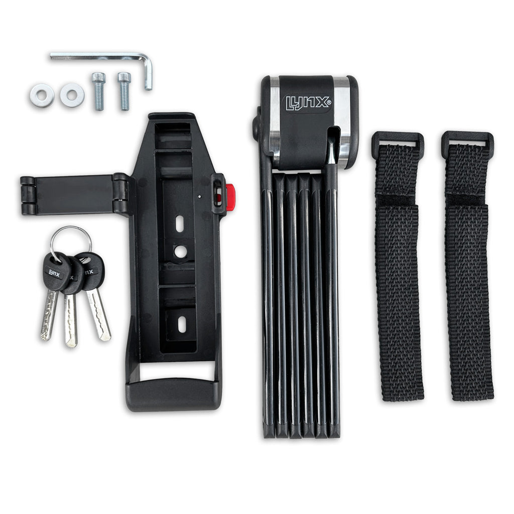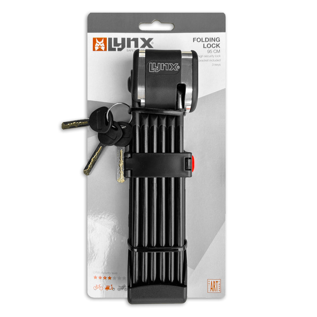 Het Lynx Pivot+ vouwslot is een hoogwaardige beveiligingsoplossing voor fietsen, e-bikes en fatbikes. Met het ART 2-keurmerk* voldoet dit slot aan strenge eisen op het gebied van duurzaamheid, weersbestendigheid en weerstand tegen aanvallen. De robuuste constructie en luxe afwerking met zilveren accenten maken het tot een aantrekkelijke en betrouwbare keuze voor iedere gebruiker. Dankzij een lengte van 95 cm en een lichtgewicht van slechts 1240 gram is het slot praktisch in gebruik en eenvoudig mee te nemen. De meegeleverde opberghouder kan aan het fietsframe worden bevestigd met inbusbouten of klittenbandstrips, zodat het slot altijd binnen handbereik is. Het afsluitbare slothuis beschermt de slotcilinder tegen stof en vuil, terwijl de corrosiewerende en waterbestendige coating zorgt voor langdurige bescherming onder alle weersomstandigheden. Met het Lynx Pivot+slot bied je je klanten een duurzame vouw- en beveiligingsoplossing die zowel functionaliteit als esthetiek verspreidt. *Een ART 2 slot is een slot met goede diefstalbeveiliging voor fietsen. Fietsverzekeraars eisen een ART slot met minimaal twee sterren in Nederland (afhankelijk van de eisen van de verzekeraar).