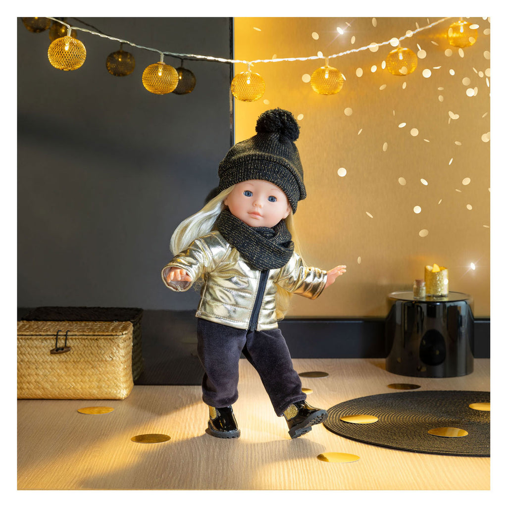 Zwarte poppen jumpsuit voor poppen van 36 centimeter groot. De jumpsuit is gemaakt van zwart velours en heeft chique, gouden details. Geschikt vanaf 4 jaar.