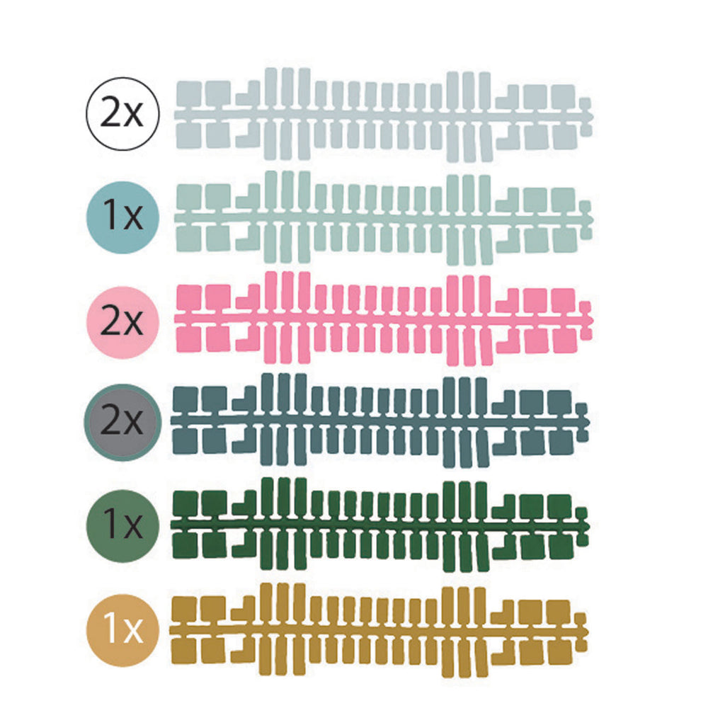 Breid je Ministeck steentjes verzameling uit met deze kleurenstrips in de wit kleuren (2x), roze (2x), donkergrijs (2x), legergroen (1x), lichtgrijs (1x) en goud (1x). Verpakt per 9 stuks.