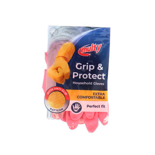 Paar huishoudhandschoenen van Multy in maat M, gemaakt van latex en een binnenvoering van dons.