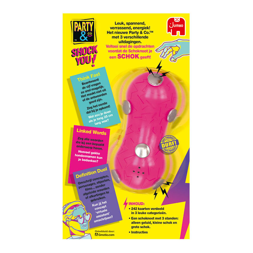 Partij & Co. Schok je! is een leuk, stressvol, verrassend en dynamisch spel dat voor veel plezier zorgt. Het spel bestaat uit 3 verschillende uitdagingen en heeft een willekeurige tijdlimiet. Het doel van het spel is om de tests te doorstaan voordat de Shocknut-tijd een schok ontstaat. De shocknut kan op 3 niveaus worden ingesteld: geen schok, schok op laag niveau of een schok op gemiddeld niveau. Het is belangrijk op te merken dat het product wordt afgegeven, niet consistent is voor het menselijk lichaam.