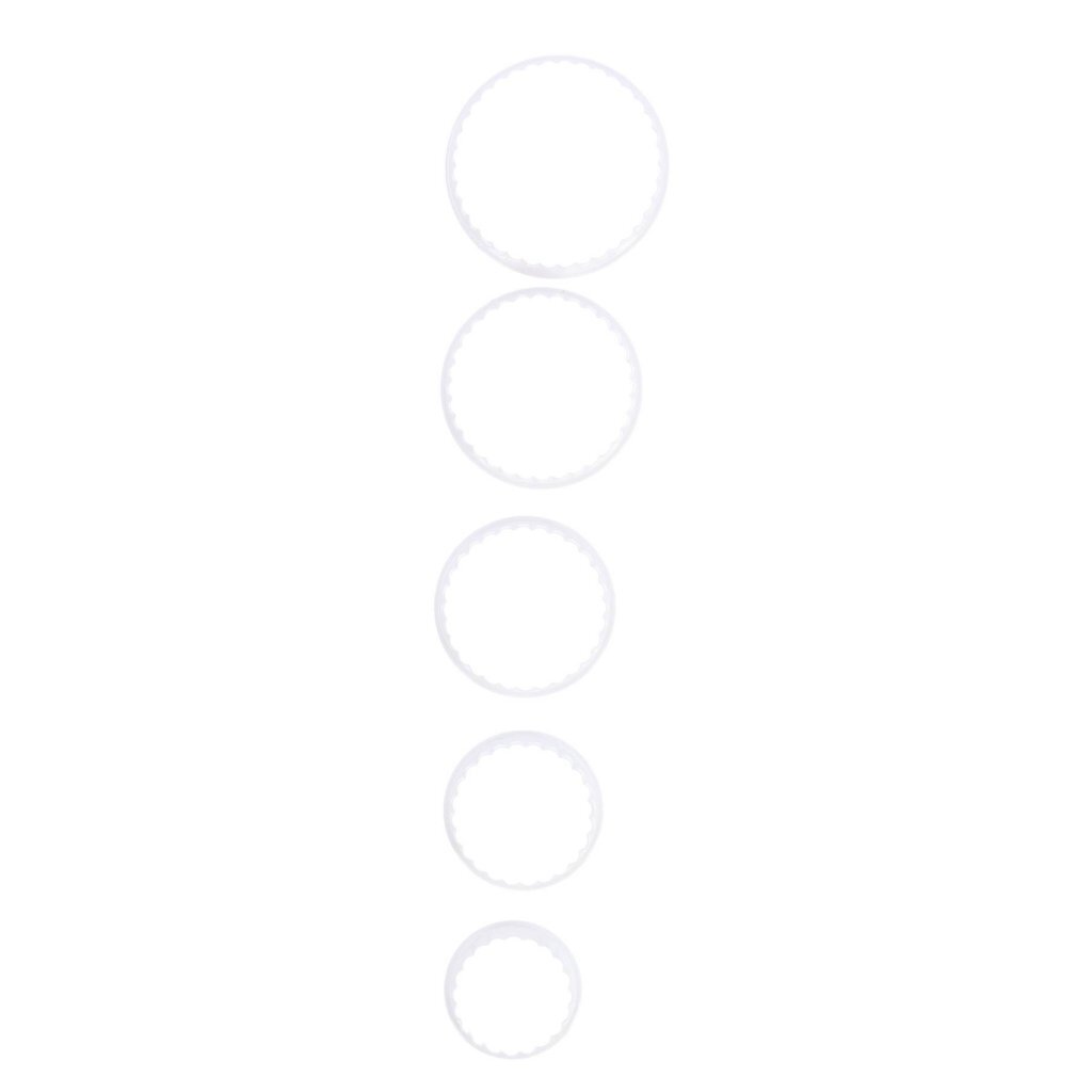 Doorsnede: 5,5-9,5 cm. Materiaal: kunststof. Kleur: wit. SET UITSTEEKVORMEN ROND 5 DLG. Een 5-delige uitsteekvormenset met 4 gekartelde ronde uitsteekvormen en 1 bewaardoosje. Geschikt voor in de vaatwasser.
