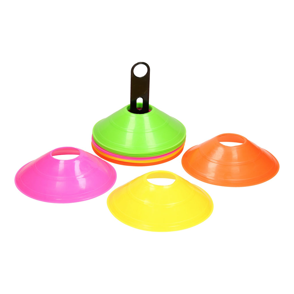Zet een veldje uit of een hindernisbaan met de Trainingshoedjes. Deze set is gemaakt van kunststof en bestaat uit een houder met 16 pionnen in 4 verschillende kleuren: 4 gele, roze, oranje en groene trainingshoedjes.