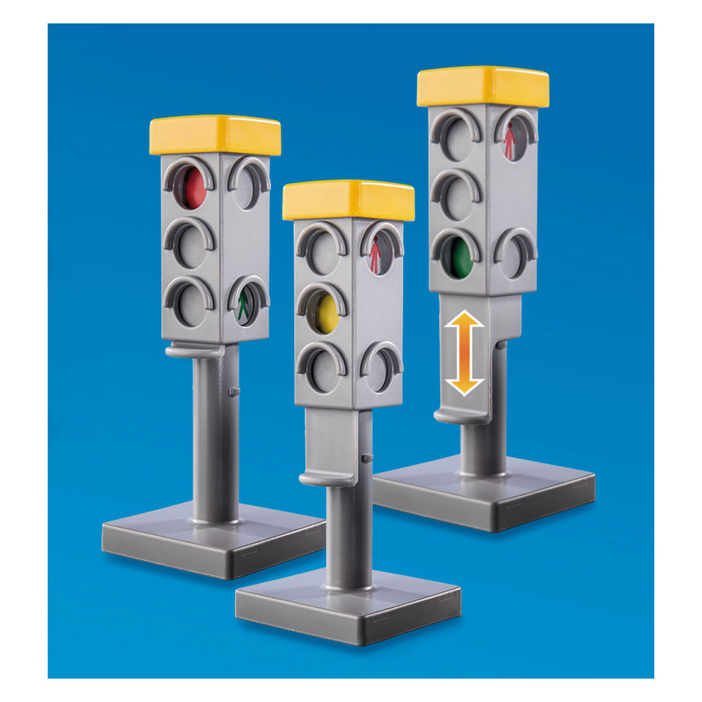 Speelset bestaande uit een brandweermotorfiets met "rijgeluiden", verstelbare verkeerslichten voor het leren van de eerste verkeersregels en een hulpverleningsvoertuig.