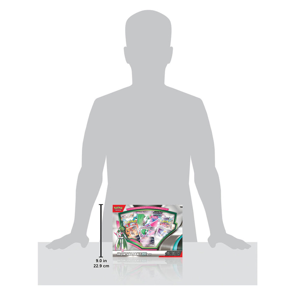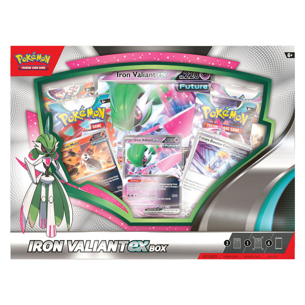 De woeste Roaring Moon ex ontwaakt uit een lang vervlogen wereld, terwijl de veerkrachtige Iron Valiant ex uit de toekomst komt! In deze Nov ex Box krijg je een promokaart en een extra grote kaart met Roaring Moon ex of Iron Valiant ex. Roaring Moon wordt opgenomen door Brute Bonnet en een Ancient Booster Energy Capsule. Iron Valiant wordt geleverd met Iron Moth en een Future Booster Energy Capsule - allemaal dingen waarvan je eerder zou willen dat je ze had om je in de toekomst te helpen. Ontdek nog meer nuttige bondgenoten in de bijgeleverde Pokémon TCG boosterpacks!