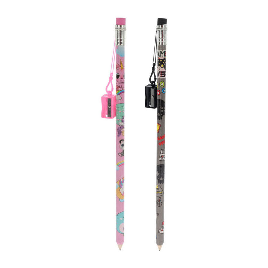 Jumbo potlood met gum en afneembare puntenslijper. Wordt geleverd in variant roze/unicorn of grijs/games.