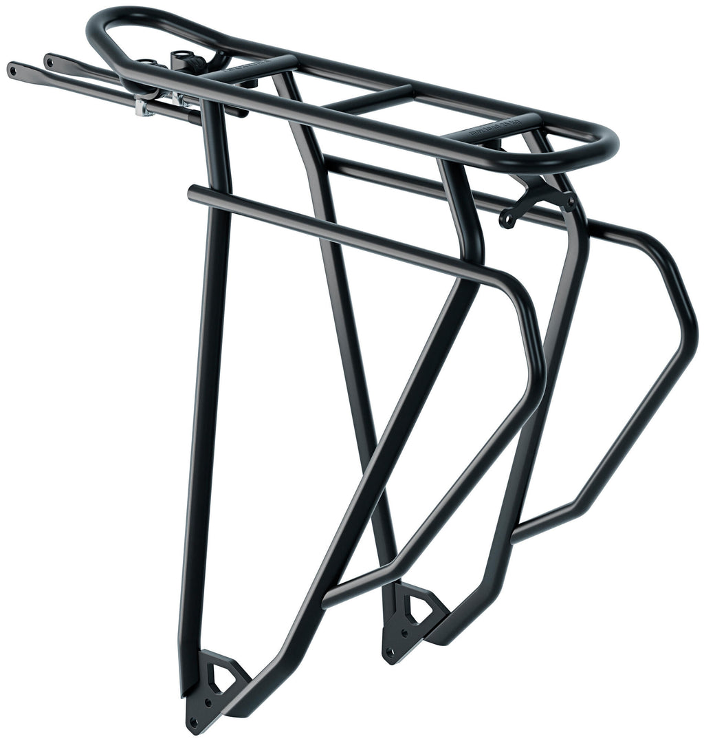 V-poot, aluminium, met bevestigingsmateriaal voor de achtervork Compatibel met alle Racktime Snap-it 2.0 componenten, door de laag geplaatste tweede tasbeugels wordt de zwaartepunt van de bagage beter verdeeld, max. draaglast 25 kg, passend voor alle gangbare pak-af-tassen, niet geschikt voor kinderzitjes, gewicht 750 g Adaptersysteem Racktime Bevestiging liggende achtervork Geschikte wielmaten 28 " Hoofdkleur zwart Max. draaglast 20 kg Montage achterop Type/soort Artikel