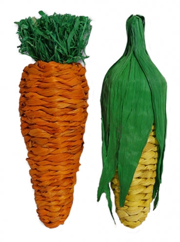 Spelen is heel belangrijk voor knaagdieren. Het houdt van de dieren die in een kooi leven scherp en voorkomt verveling. Ook knagen is erg belangrijk voor de beestjes. Deze extra grote maiskolf en wortel zijn gemaakt van rotan en maisblad en zijn gekleurd met dierveilige verf. Hierdoor zal jouw knaagdier graag met dit speelgoed spelen of er op knagen.
