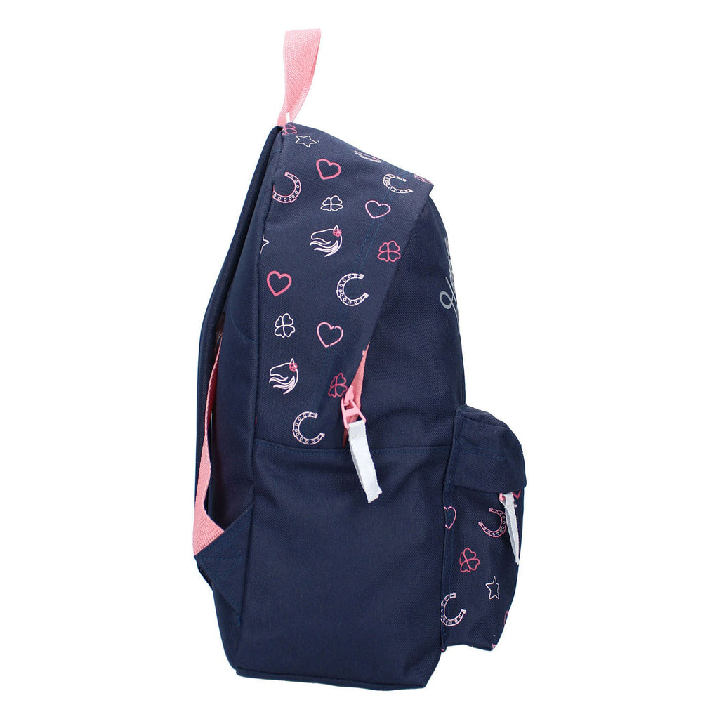Deze leuke rugzak van Milky Kiss uit de Horse Club collectie is ideaal voor alle paardenfans! De rugzak is donkerblauw van kleur en heeft op de voorkant een vrolijke print. Het hoofdvak biedt voldoende ruimte voor bijvoorbeeld schoolspullen. Voor kleinere spulletjes komt het voorvak goed van pas. Beide vakken sluiten met een zilveren rits en verder is tas afgewerkt met roze details. Aan het voorvak is een Milky Kiss-badge vastgemaakt. Aan de bovenkant van de rugzak is een handige lus waardoor de tas ook aan de hand te dragen is. Tot slot zijn de schouderbanden verstelbaar en voor iedereen op maat te maken.