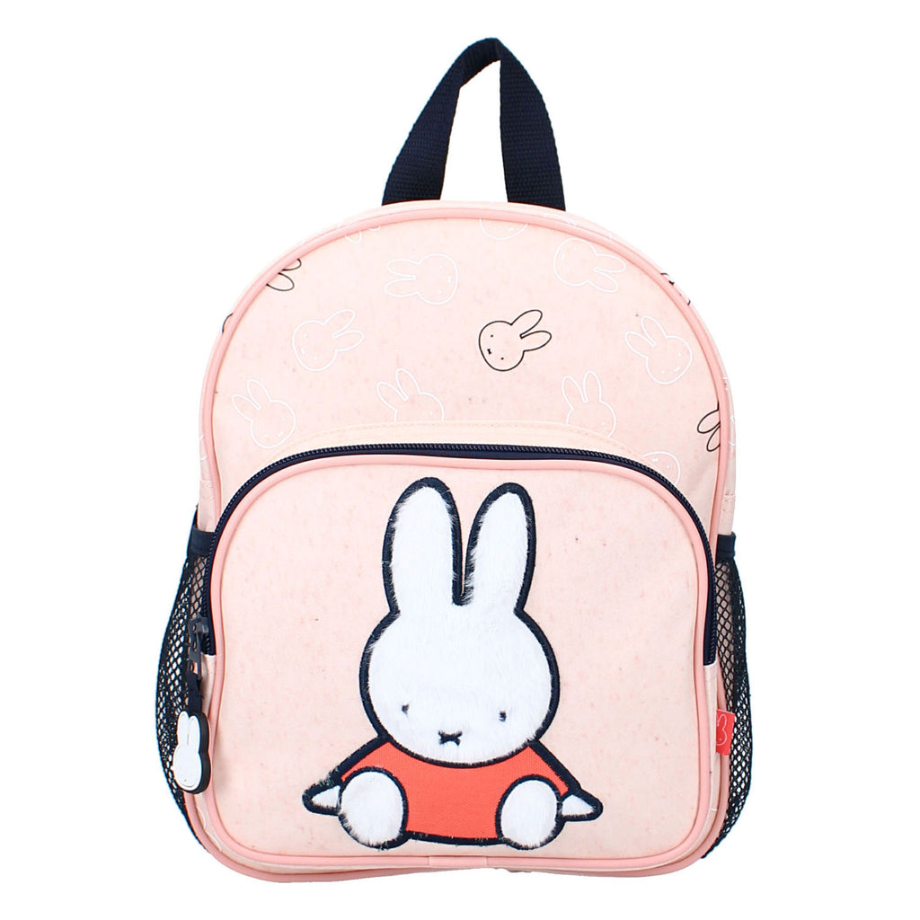 Lichtroze Nijntje rugzak met afbeelding van Nijntje op het voorvak. Rugzak met grote vak, voorvak, zijvakken, lus en schouderbanden. Afmeting: 29 bij 23 bij 8 cm.